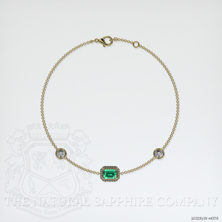 The bracelet features a beautiful, transparent 0.69 carat emerald cut shape green emerald with the dimensions of 5.97 x 4.57 x 3.70 mm and a emerald cut. It has a clarity grade of very very slightly included (evaluated at eye level), medium intense color saturation, and an excellent polish. The origin of this emerald is Russia.