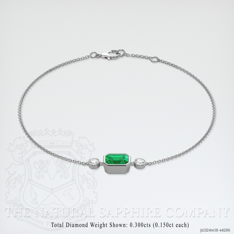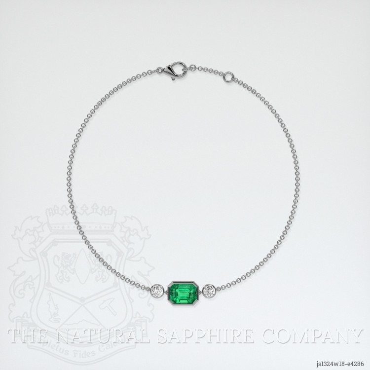 The bracelet features a beautiful, transparent 1.23 carat emerald cut shape green emerald with the dimensions of 7.43 x 5.74 x 4.30 mm and a emerald cut. It has a clarity grade of very slightly included (evaluated at eye level), intense color saturation, and an excellent polish. The origin of this emerald is Zambia.