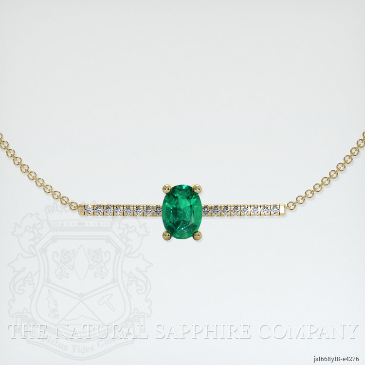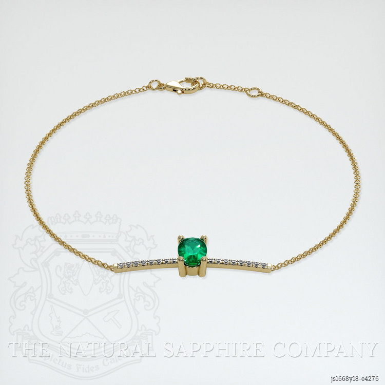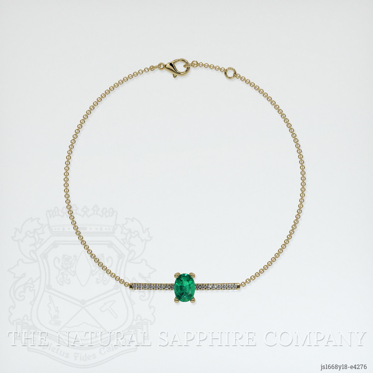 The bracelet features a beautiful, transparent 0.86 carat oval shape green emerald with the dimensions of 7.10 x 5.21 x 3.88 mm and a mixed brilliant cut. It has a clarity grade of very slightly included (evaluated at eye level), vivid color saturation, and an excellent polish. The origin of this emerald is Zambia.
