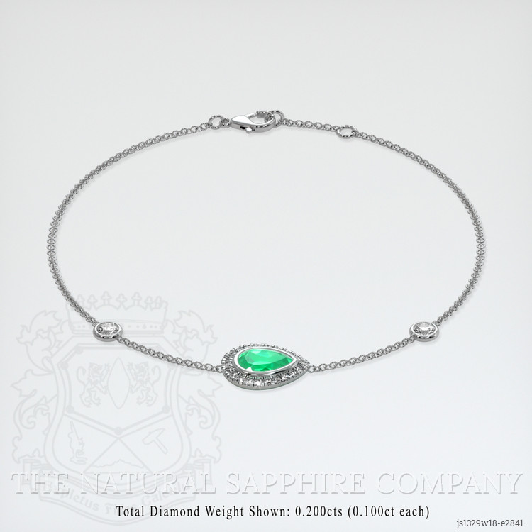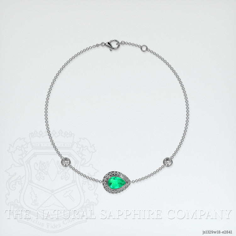 The bracelet features a beautiful, transparent 0.76 carat pear shape green emerald with the dimensions of 7.86 x 5.37 x 3.36 mm and a mixed brilliant cut. It has a clarity grade of very slightly included (evaluated at eye level), intense color saturation, and an excellent polish. The origin of this emerald is Colombia.