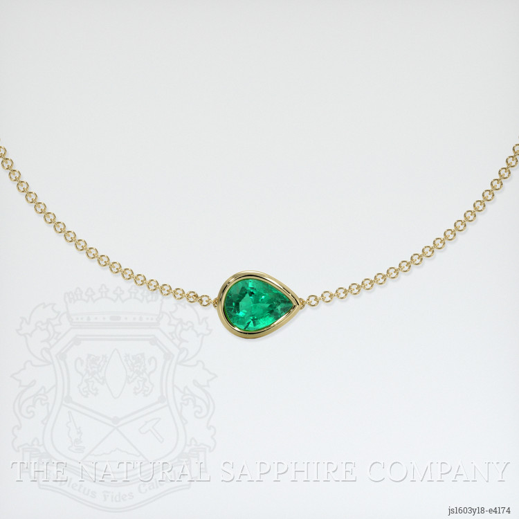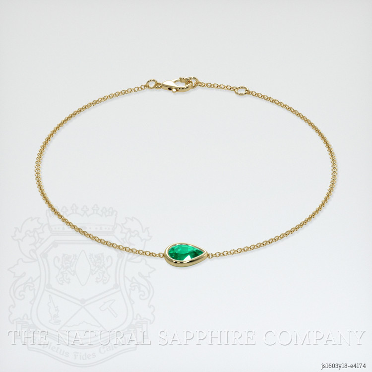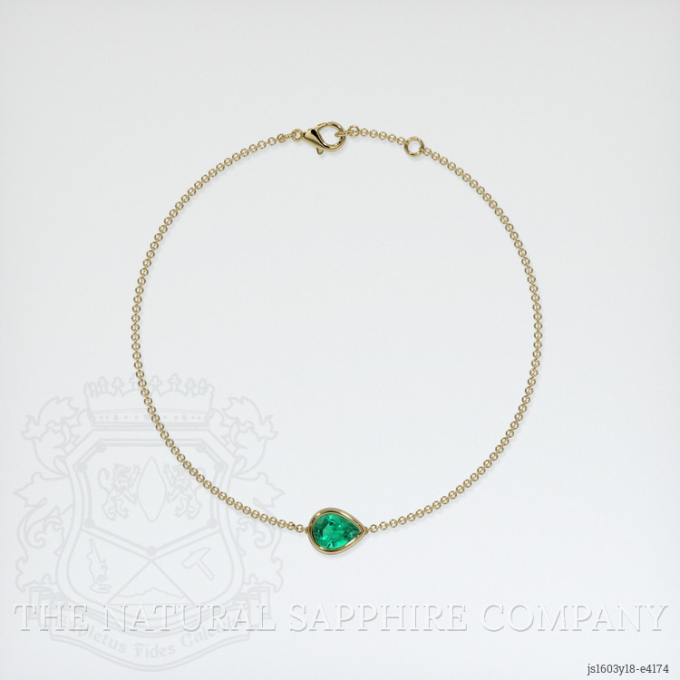 The bracelet features a beautiful, transparent 0.78 carat pear shape green emerald with the dimensions of 7.07 x 5.49 x 4.00 mm and a mixed brilliant cut. It has a clarity grade of slightly included (evaluated at eye level), intense color saturation, and an excellent polish. The origin of this emerald is Zambia.