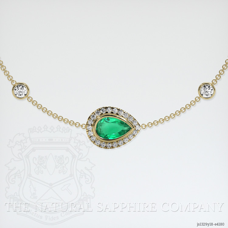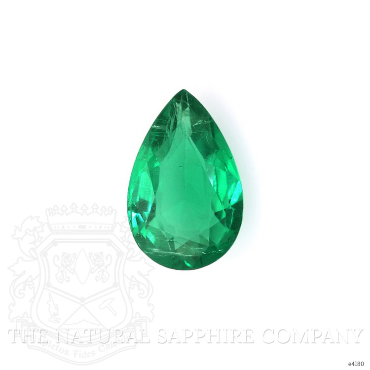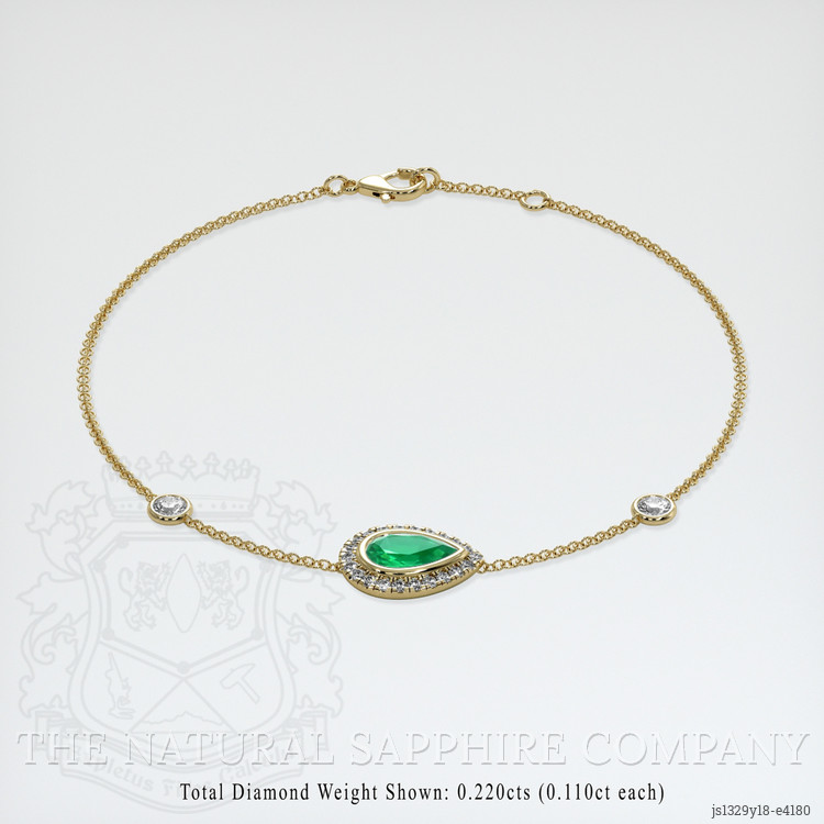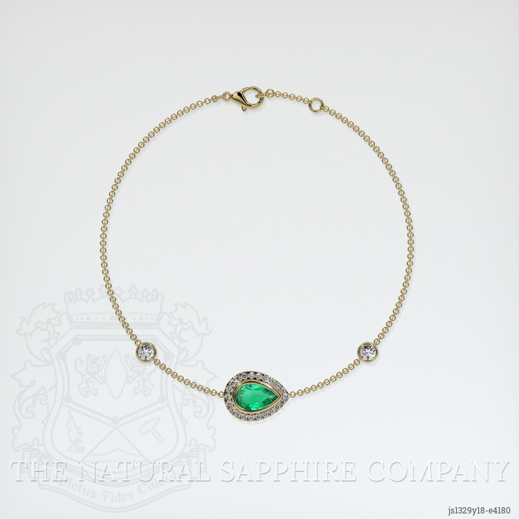 The bracelet features a beautiful, transparent 0.84 carat pear shape green emerald with the dimensions of 8.52 x 5.48 x 3.05 mm and a mixed brilliant cut. It has a clarity grade of very slightly included (evaluated at eye level), medium intense color saturation, and an excellent polish. The origin of this emerald is Zambia.