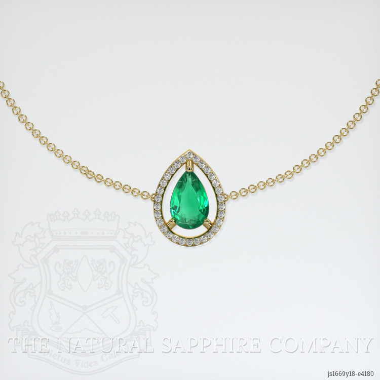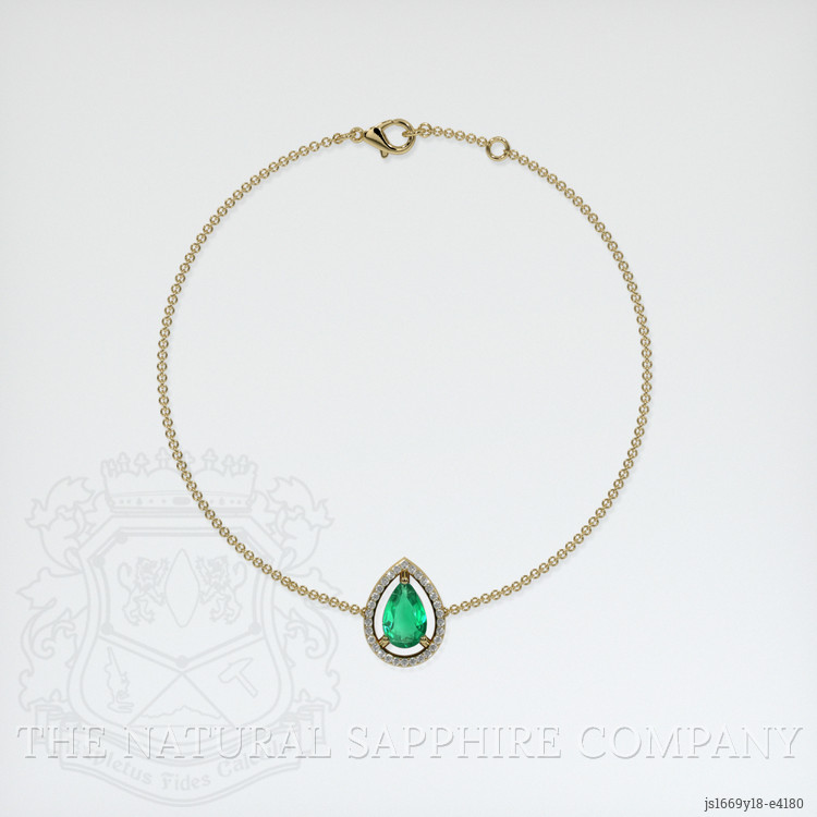 The bracelet features a beautiful, transparent 0.84 carat pear shape green emerald with the dimensions of 8.52 x 5.48 x 3.05 mm and a mixed brilliant cut. It has a clarity grade of very slightly included (evaluated at eye level), medium intense color saturation, and an excellent polish. The origin of this emerald is Zambia.