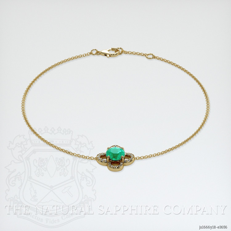 The bracelet features a beautiful, transparent 0.79 carat round shape green emerald with the dimensions of 5.88 x 5.87 x 3.93 mm and a mixed brilliant cut. It has a clarity grade of slightly included (evaluated at eye level), medium color saturation, and an excellent polish. The origin of this emerald is Zambia.