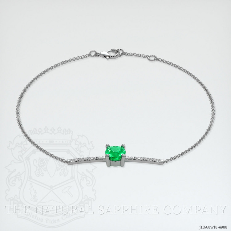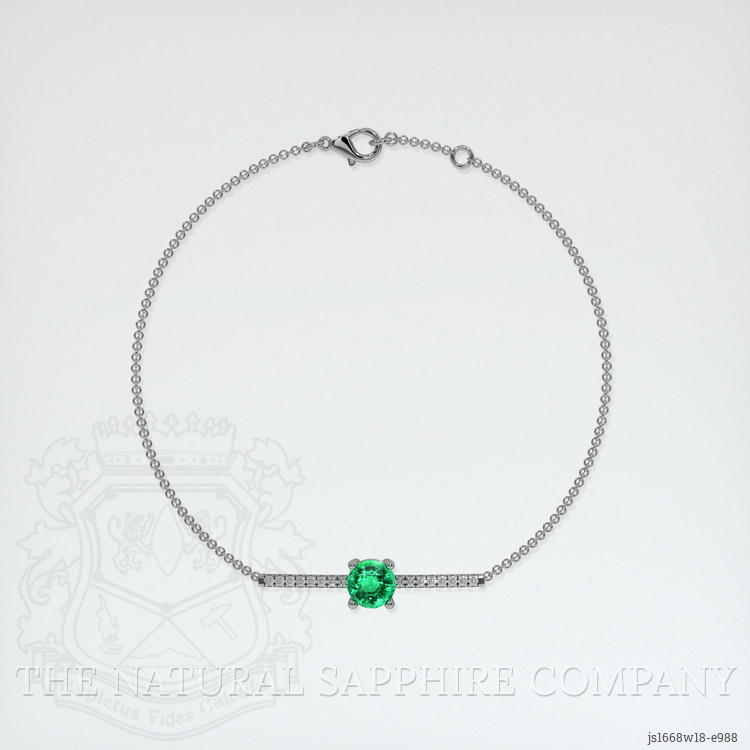 The bracelet features a beautiful, transparent 0.88 carat round shape green emerald with the dimensions of 6.18 x 6.09 x 4.30 mm and a mixed brilliant cut. It has a clarity grade of very slightly included (evaluated at eye level), intense color saturation, and an excellent polish. The origin of this emerald is Zambia.