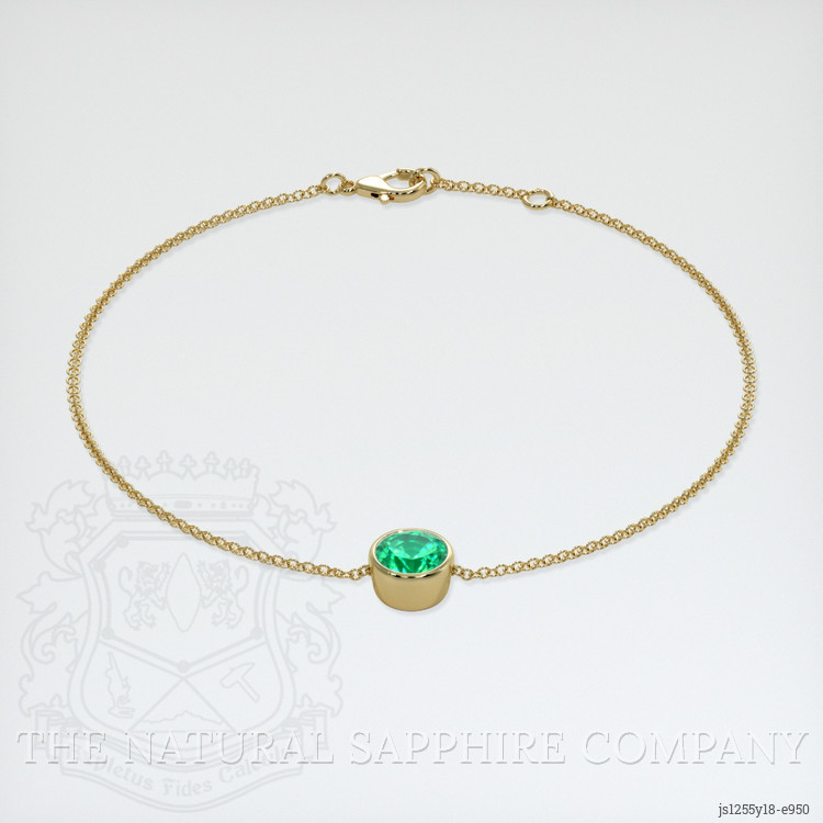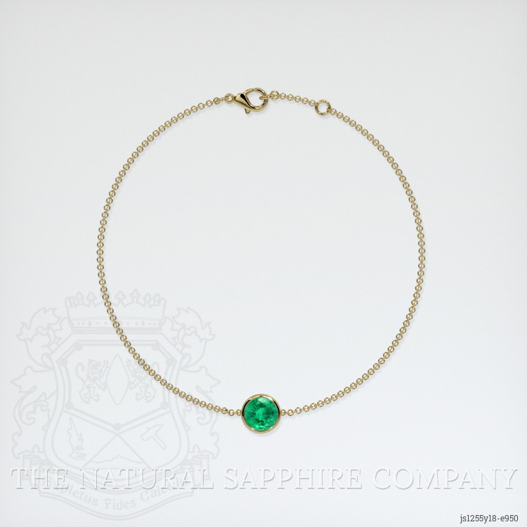 The bracelet features a beautiful, transparent 1.02 carat round shape green emerald with the dimensions of 6.45 x 6.40 x 4.52 mm and a mixed brilliant cut. It has a clarity grade of slightly included (evaluated at eye level), intense color saturation, and an excellent polish. The origin of this emerald is Zambia.