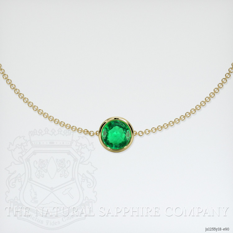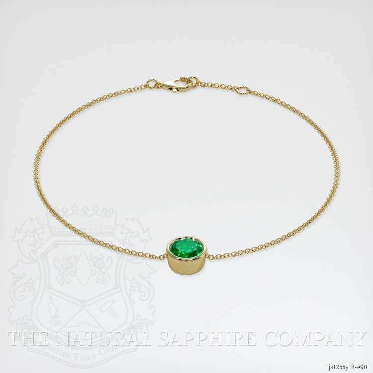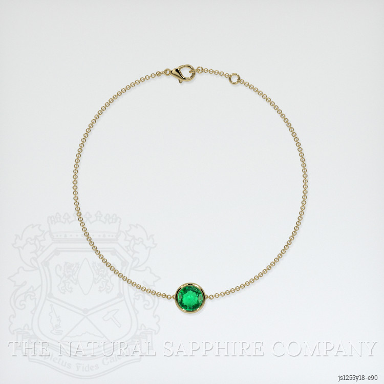 The bracelet features a beautiful, transparent 1.25 carat round shape green emerald with the dimensions of 7.31 x 7.23 x 4.01 mm and a mixed brilliant cut. It has a clarity grade of very slightly included (evaluated at eye level), vivid color saturation, and an excellent polish. The origin of this emerald is Zambia.