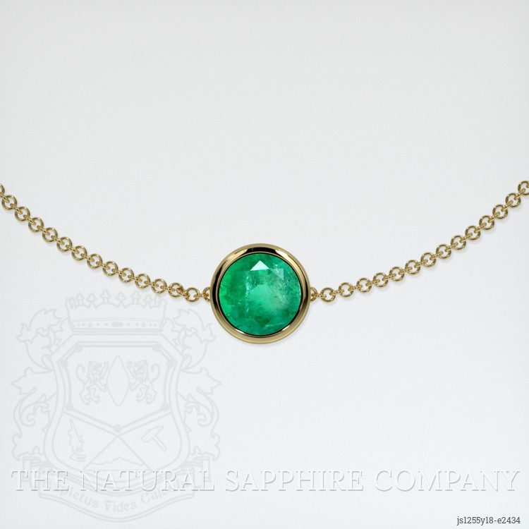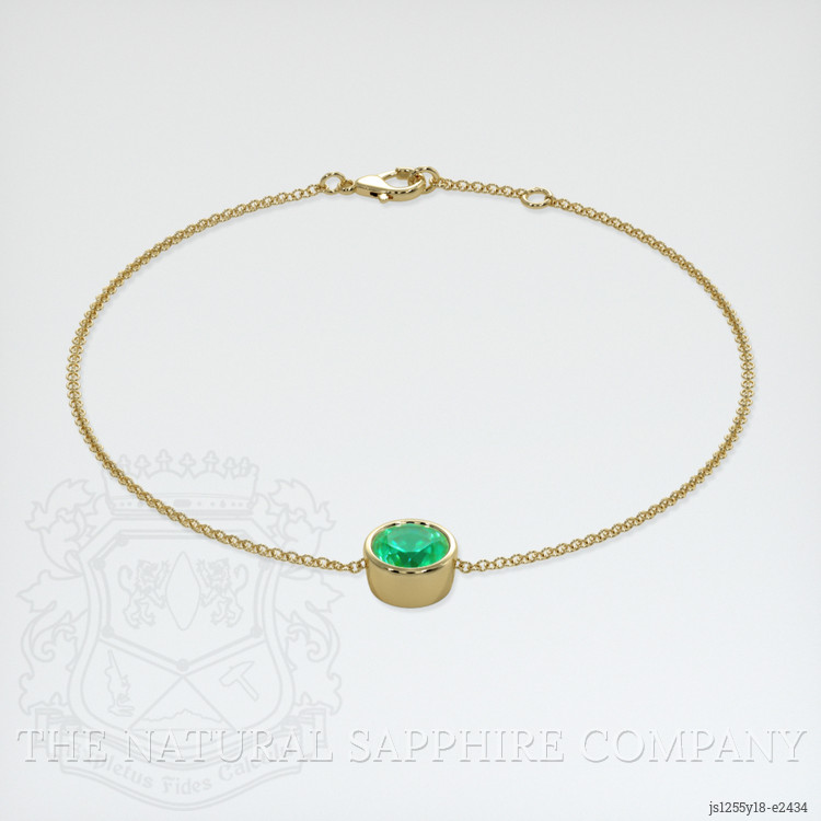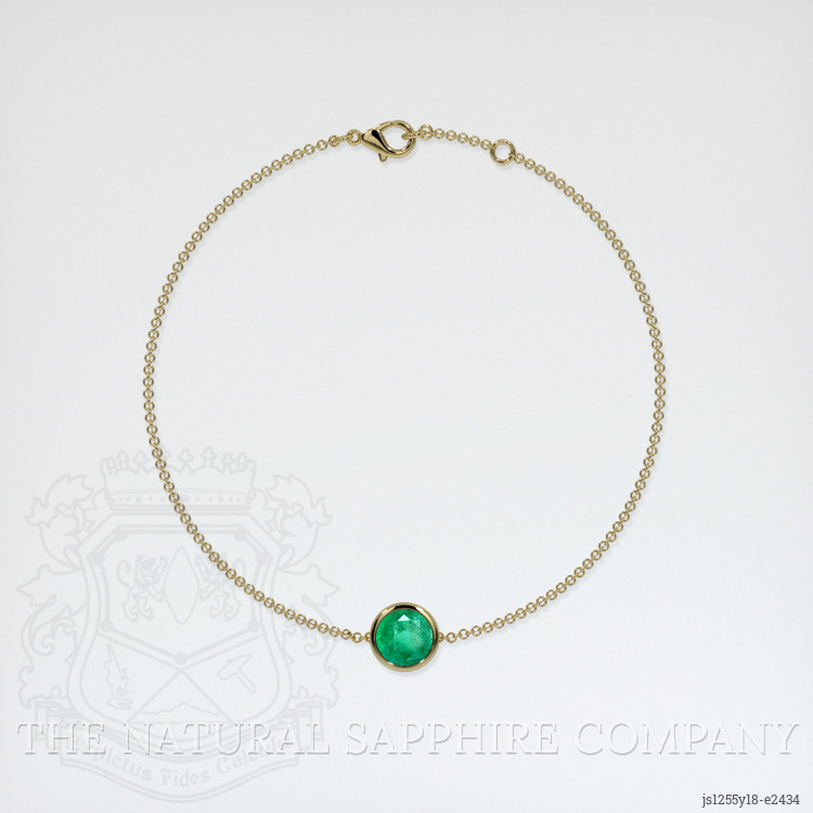 The bracelet features a beautiful, transparent 1.28 carat round shape green emerald with the dimensions of 6.88 x 6.75 x 5.01 mm and a mixed brilliant cut. It has a clarity grade of slightly included (evaluated at eye level), medium color saturation, and an excellent polish. The origin of this emerald is Zambia.