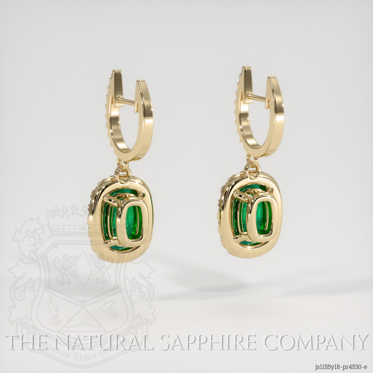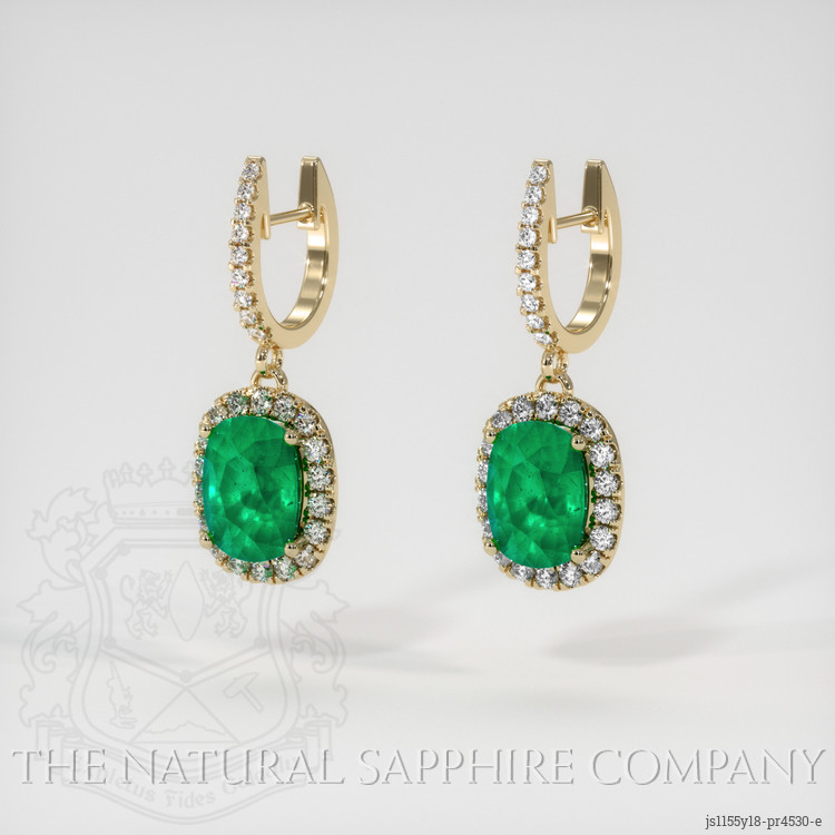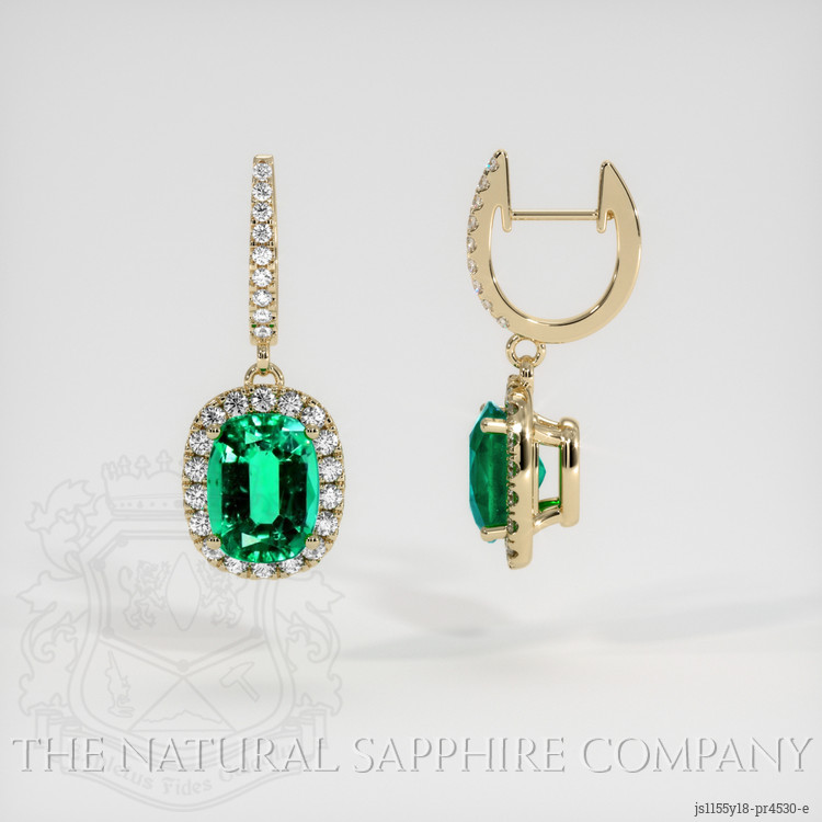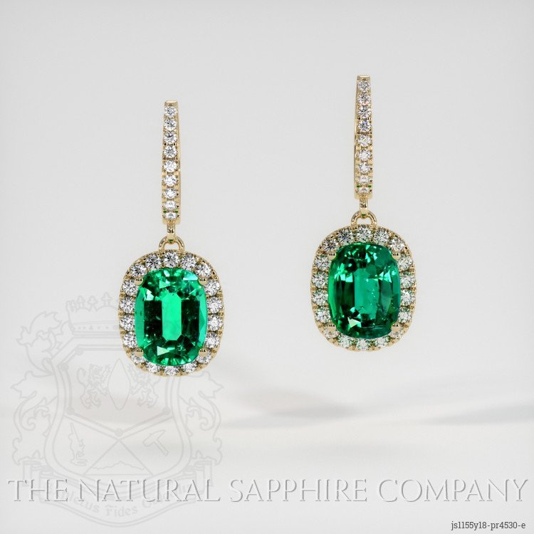 The earrings feature a beautiful, transparent pair of emeralds that are 2.46 total carat weight. They are cushion shape green emeralds, with the dimensions of 7.61 x 5.67 x 4.34 mm and are mixed brilliant cut, have a clarity grade of very slightly included (evaluated at eye level), intense color saturation, and an excellent polish. The origin of this pair of emeralds is Zambia.