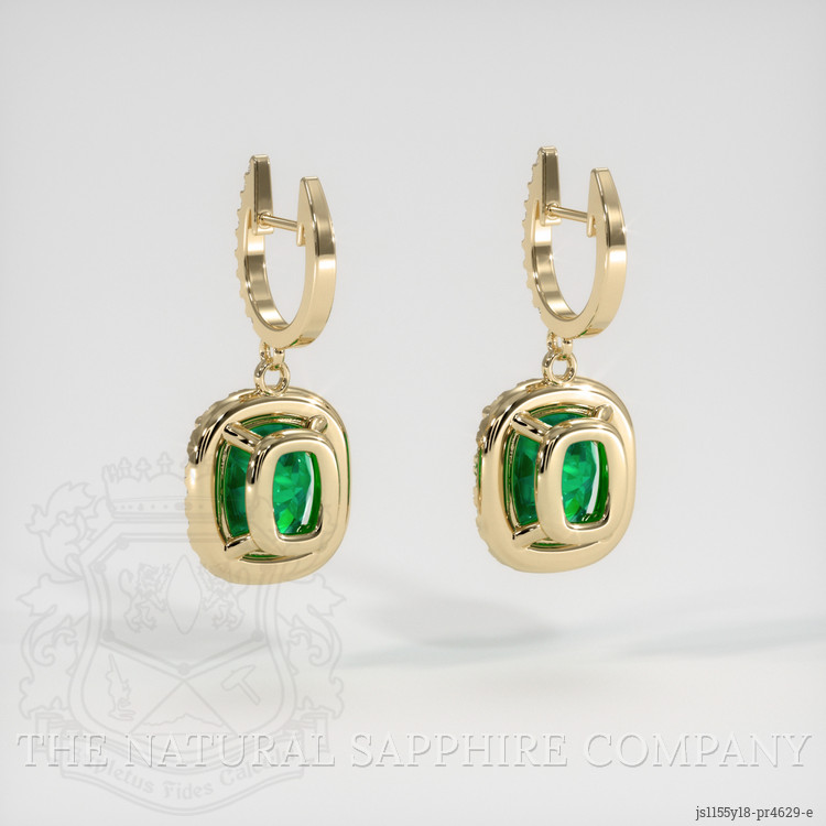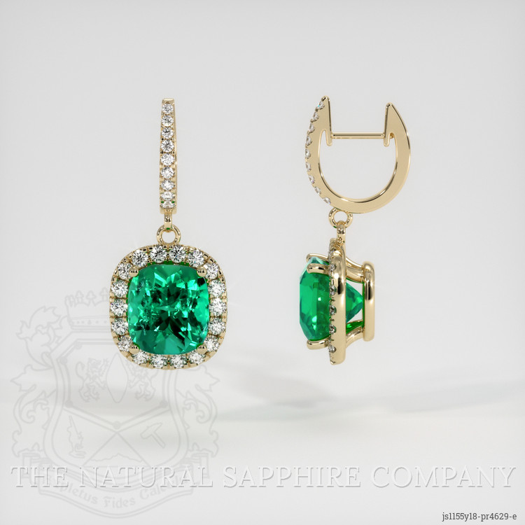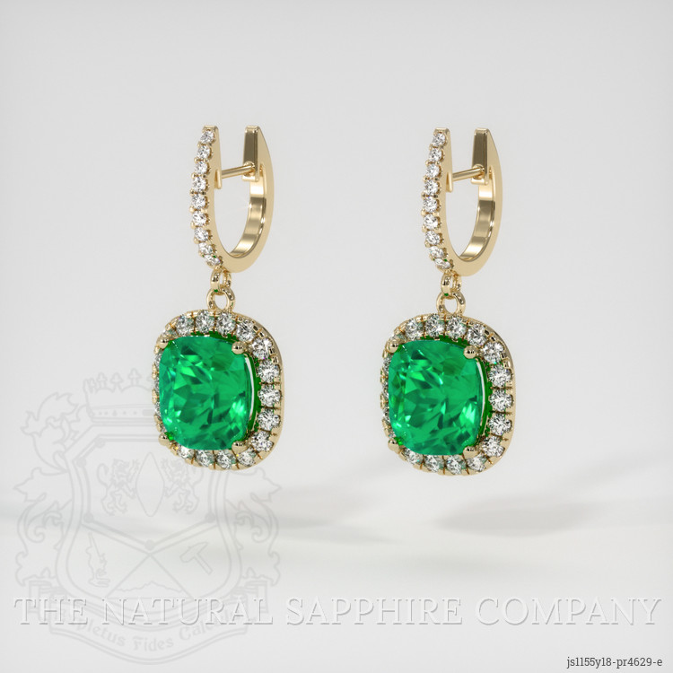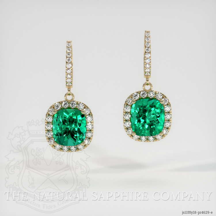 The earrings feature a beautiful, transparent AGL certified pair of emeralds that are 3.63 total carat weight. They are cushion shape green emeralds, with the dimensions of 7.77 x 6.94 x 5.87 mm and are modified brilliant cut, have a clarity grade of very slightly included (evaluated at eye level), intense color saturation, and an excellent polish. The origin of this pair of emeralds is Colombia.