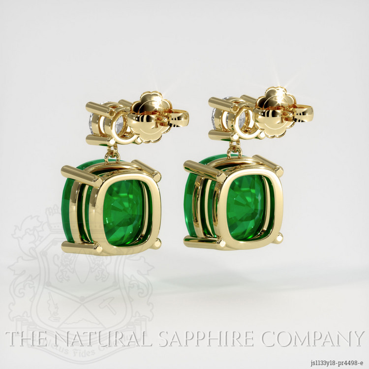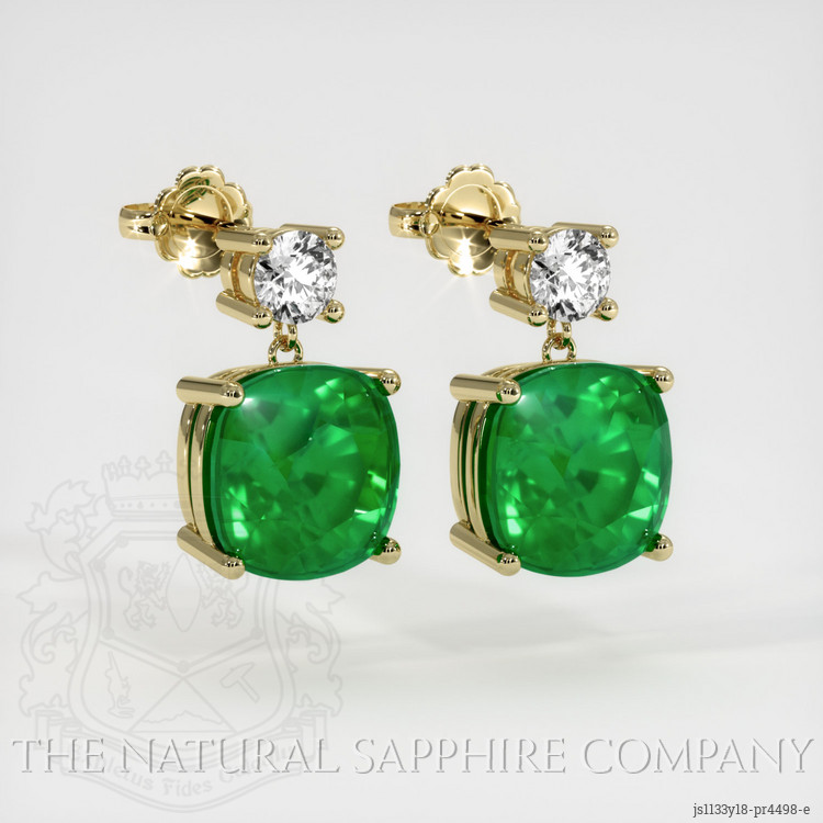 The earrings feature a beautiful, transparent pair of emeralds that are 6.62 total carat weight. They are cushion shape green emeralds, with the dimensions of 9.00 x 8.82 x 6.61 mm and are mixed brilliant cut, have a clarity grade of very slightly included (evaluated at eye level), vivid color saturation, and an excellent polish. The origin of this pair of emeralds is Zambia.