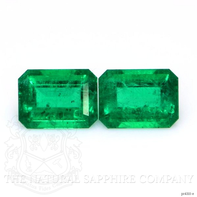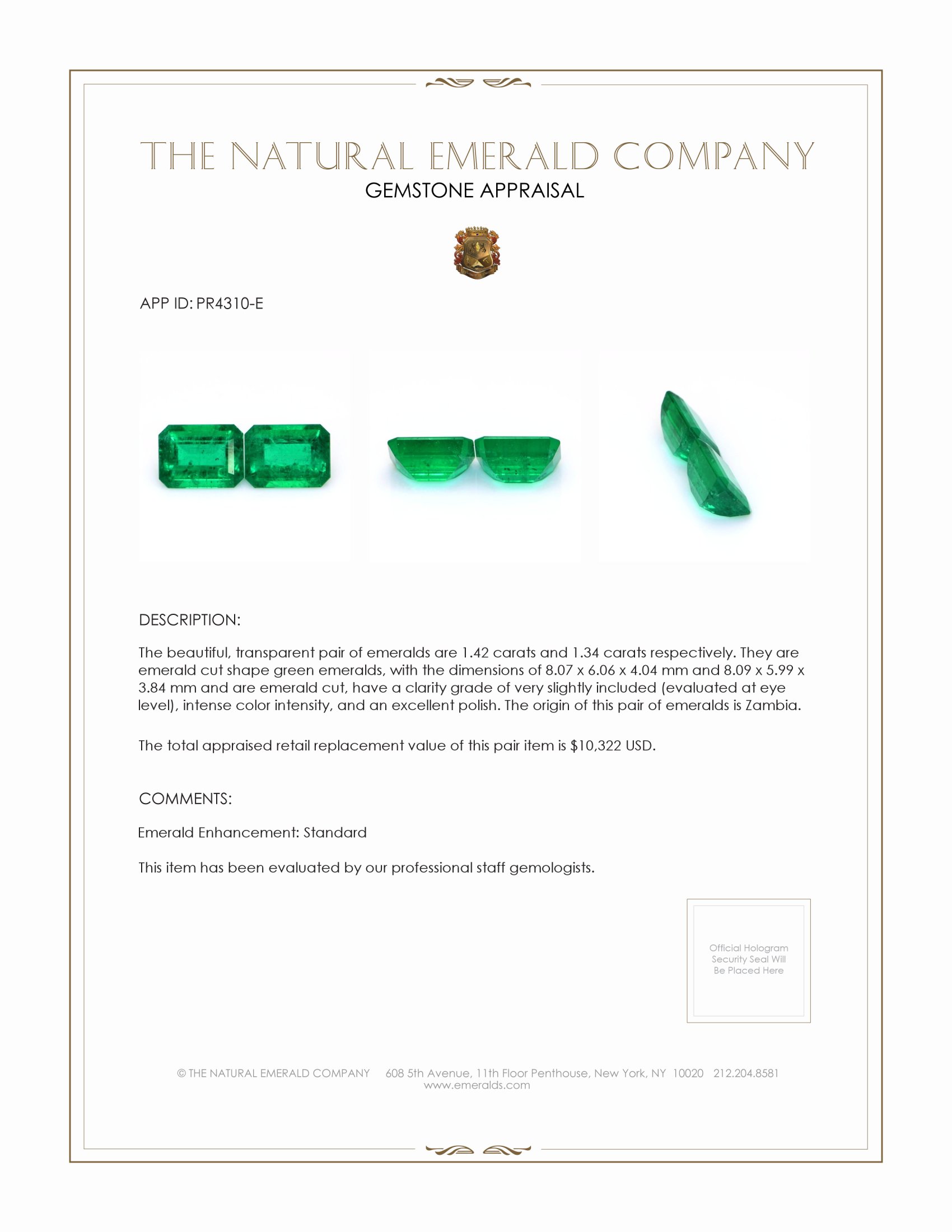The earrings feature a beautiful, transparent pair of emeralds that are 2.76 total carat weight. They are emerald cut shape green emeralds, with the dimensions of 8.07 x 6.06 x 4.04 mm and are emerald cut, have a clarity grade of very slightly included (evaluated at eye level), intense color saturation, and an excellent polish. The origin of this pair of emeralds is Zambia.