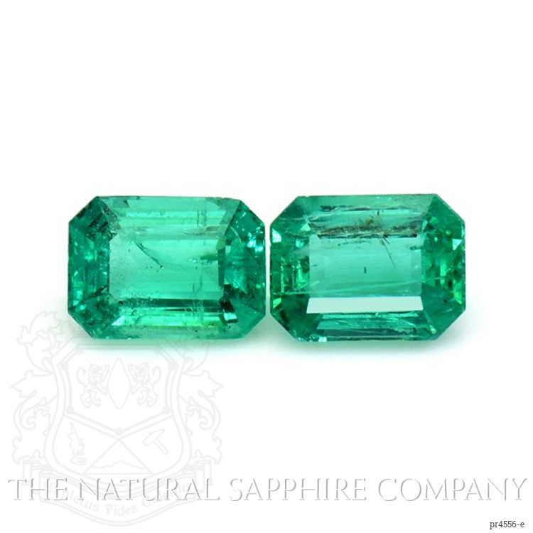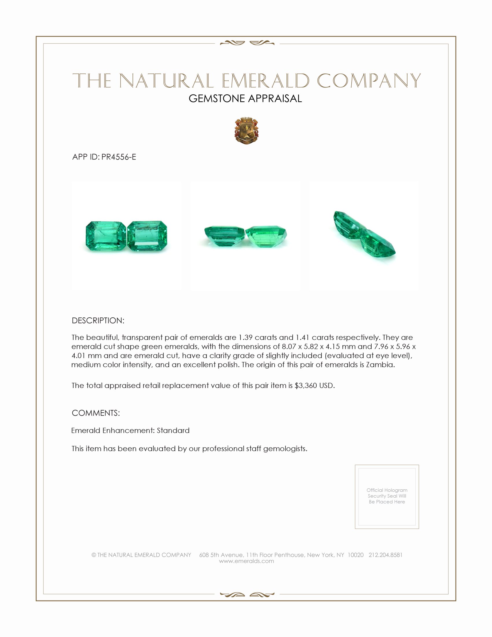 The earrings feature a beautiful, transparent pair of emeralds that are 2.80 total carat weight. They are emerald cut shape green emeralds, with the dimensions of 7.96 x 5.96 x 4.01 mm and are emerald cut, have a clarity grade of slightly included (evaluated at eye level), medium color saturation, and an excellent polish. The origin of this pair of emeralds is Zambia.
