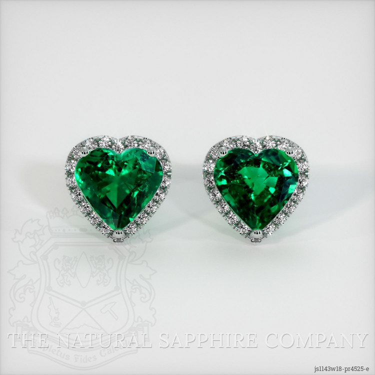 The earrings feature a beautiful, transparent pair of emeralds that are 6.58 total carat weight. They are heart shape green emeralds, with the dimensions of 10.14 x 10.52 x 6.76 mm and are mixed brilliant cut, have a clarity grade of slightly included (evaluated at eye level), vivid color saturation, and an excellent polish. Enhancement: standard. The origin of this pair of emeralds is Zambia.