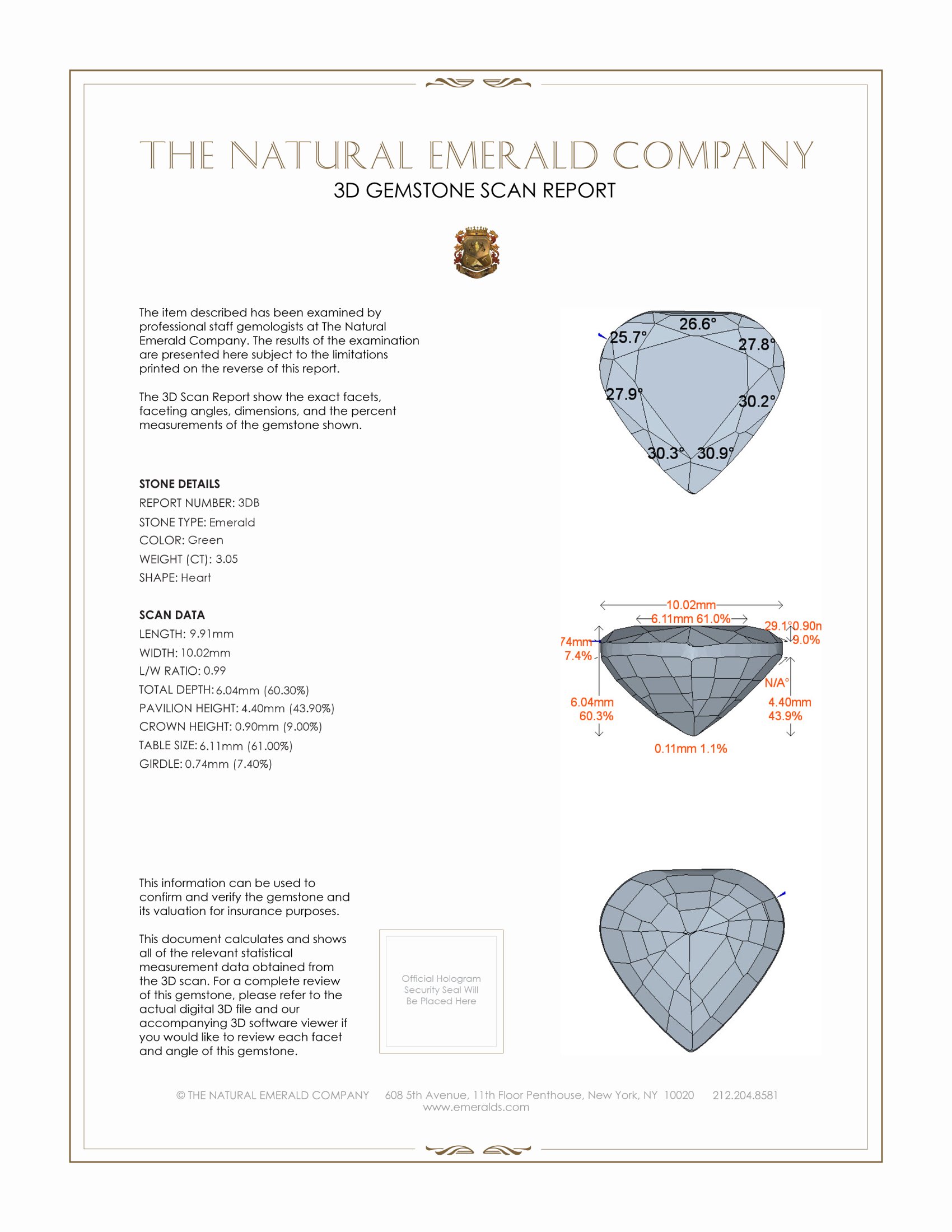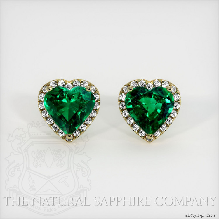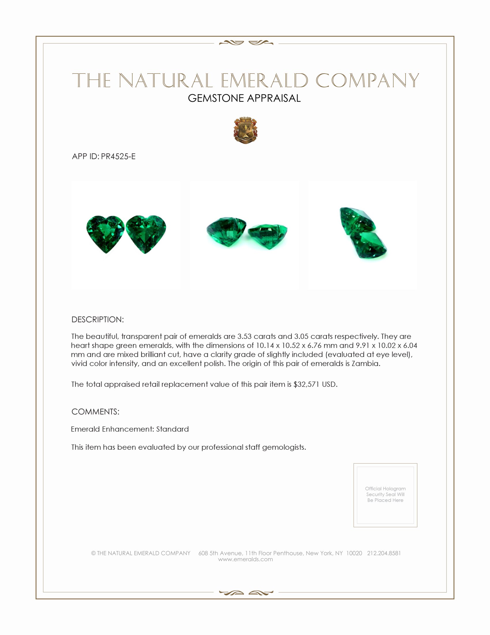 The earrings feature a beautiful, transparent pair of emeralds that are 6.58 total carat weight. They are heart shape green emeralds, with the dimensions of 10.14 x 10.52 x 6.76 mm and are mixed brilliant cut, have a clarity grade of slightly included (evaluated at eye level), vivid color saturation, and an excellent polish. The origin of this pair of emeralds is Zambia.