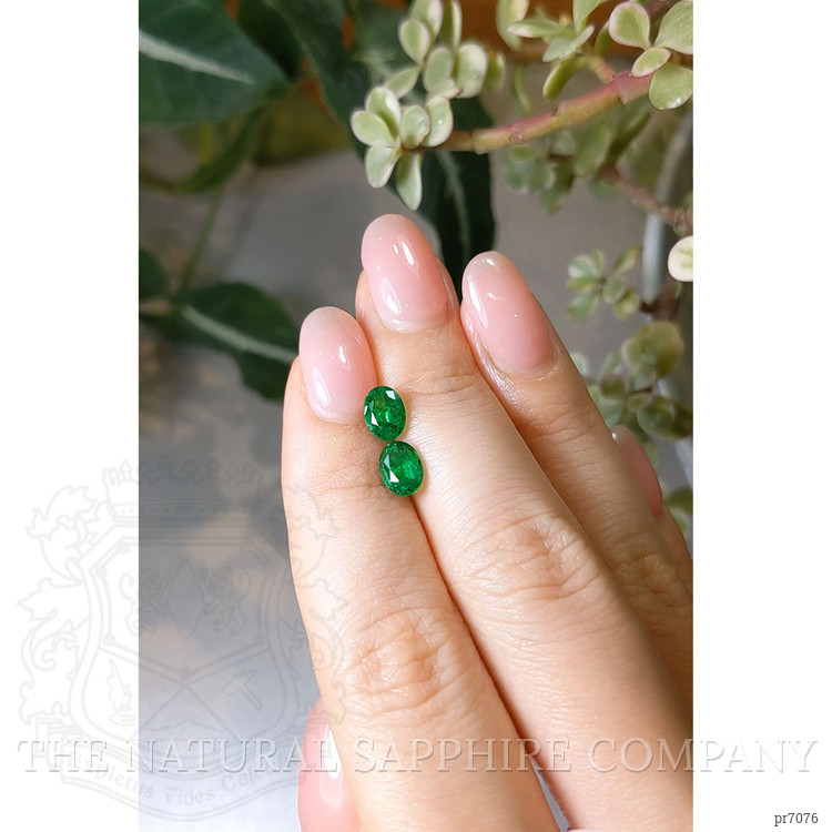These emeralds, 1.69 total carat weight, are more than mere stones; they are tangible slices of earth's delicate art. Mined with care and a keen sense of responsibility, each oval-shaped gem reveals dimensions of 7.05 x 5.17 x 3.79 mm. The spectacle of their mixed brilliant cut offers a dance of light, with slightly included clarity that whispers of their natural origin, ensuring each gem speaks with authenticity and truth. Their vivid color saturation and excellent polish are testaments to the meticulous crafting and profound respect for nature's treasures.