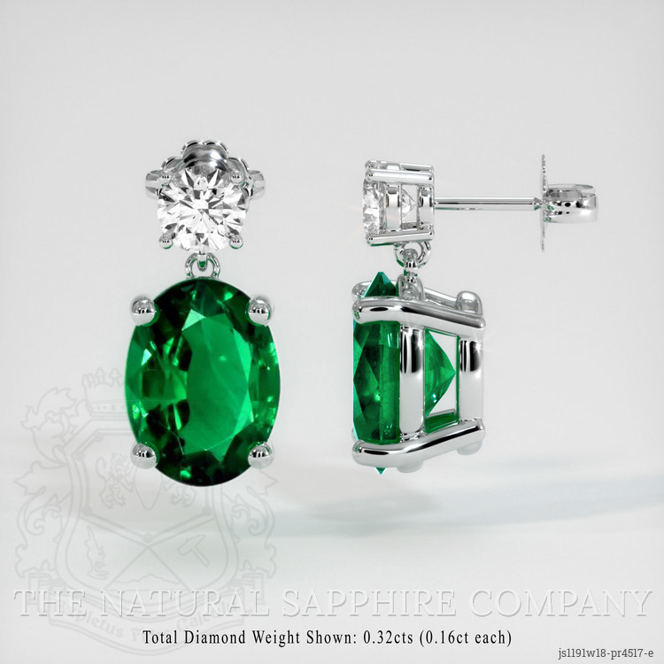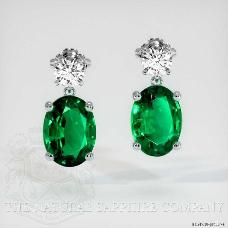 The earrings feature a beautiful, transparent pair of emeralds that are 2.10 total carat weight. They are oval shape green emeralds, with the dimensions of 8.22 x 5.97 x 3.53 mm and are mixed brilliant cut, have a clarity grade of very slightly included (evaluated at eye level), vivid color saturation, and an excellent polish. Enhancement: standard. The origin of this pair of emeralds is Zambia.