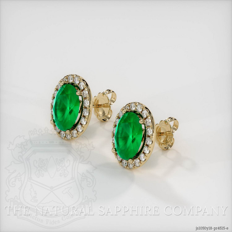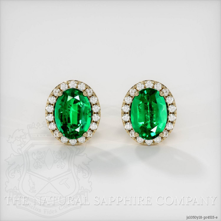 The earrings feature a beautiful, transparent pair of emeralds that are 2.22 total carat weight. They are oval shape green emeralds, with the dimensions of 8.04 x 5.77 x 4.08 mm and are mixed brilliant cut, have a clarity grade of very slightly included (evaluated at eye level), vivid color saturation, and an excellent polish. The origin of this pair of emeralds is Zambia.