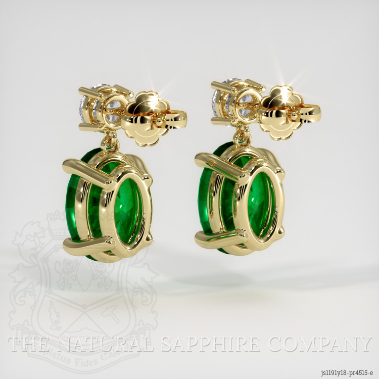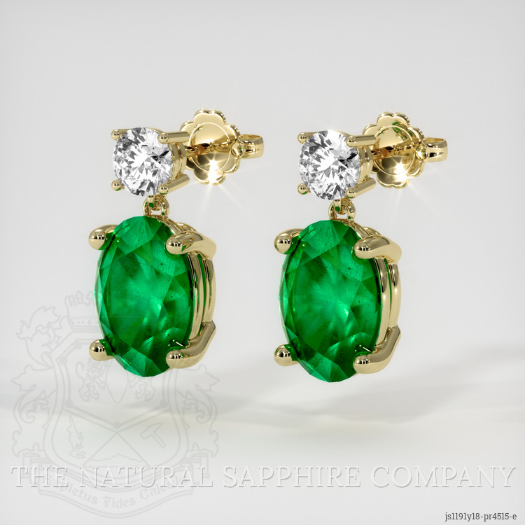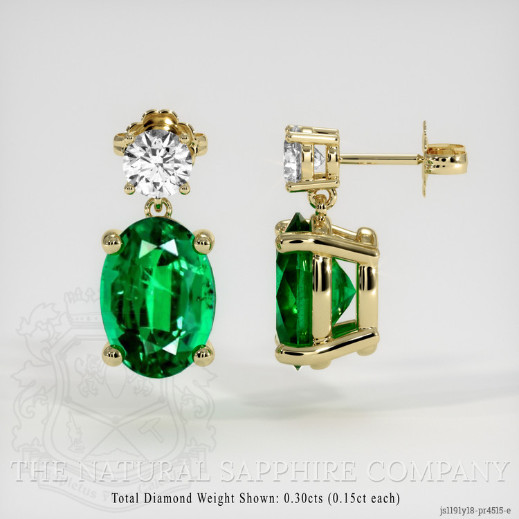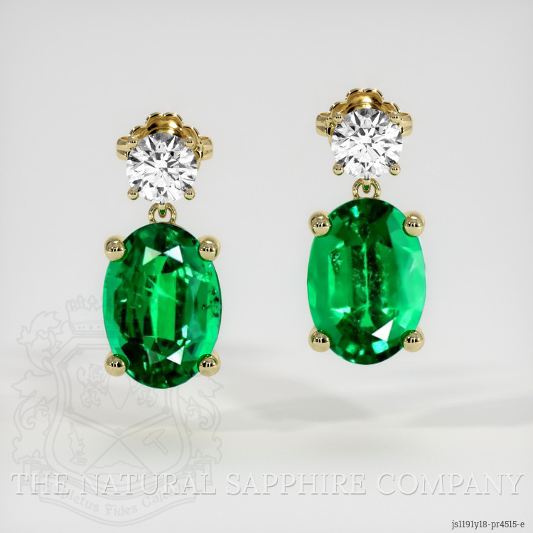 The earrings feature a beautiful, transparent pair of emeralds that are 2.22 total carat weight. They are oval shape green emeralds, with the dimensions of 8.04 x 5.77 x 4.08 mm and are mixed brilliant cut, have a clarity grade of very slightly included (evaluated at eye level), vivid color saturation, and an excellent polish. The origin of this pair of emeralds is Zambia.