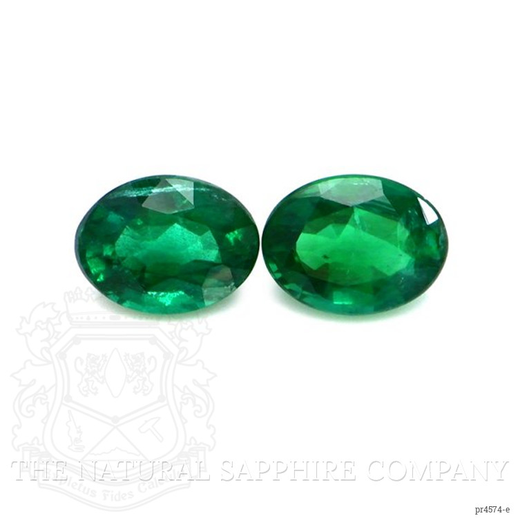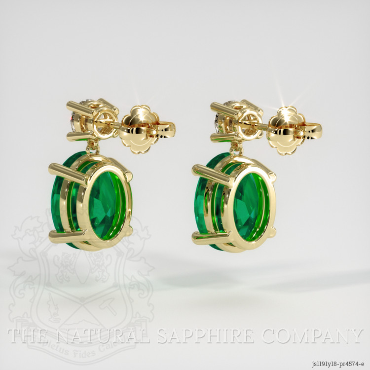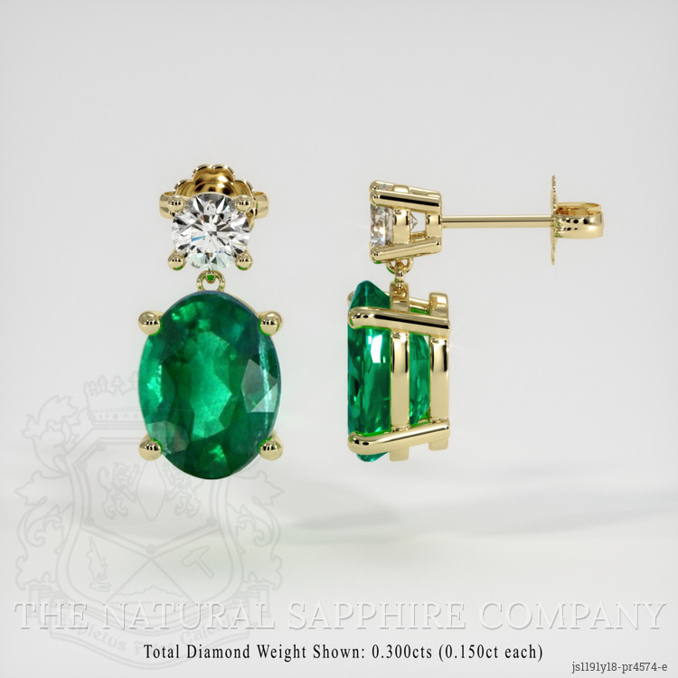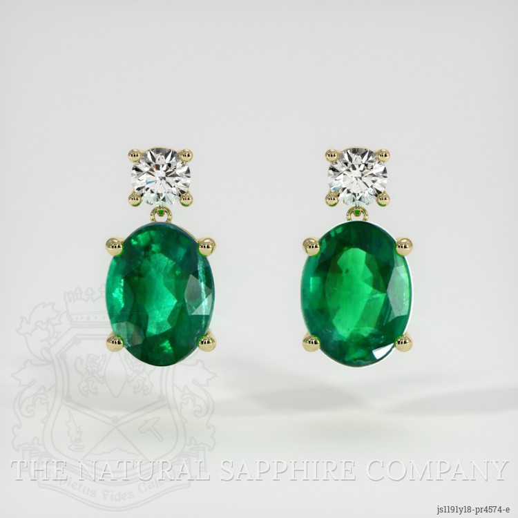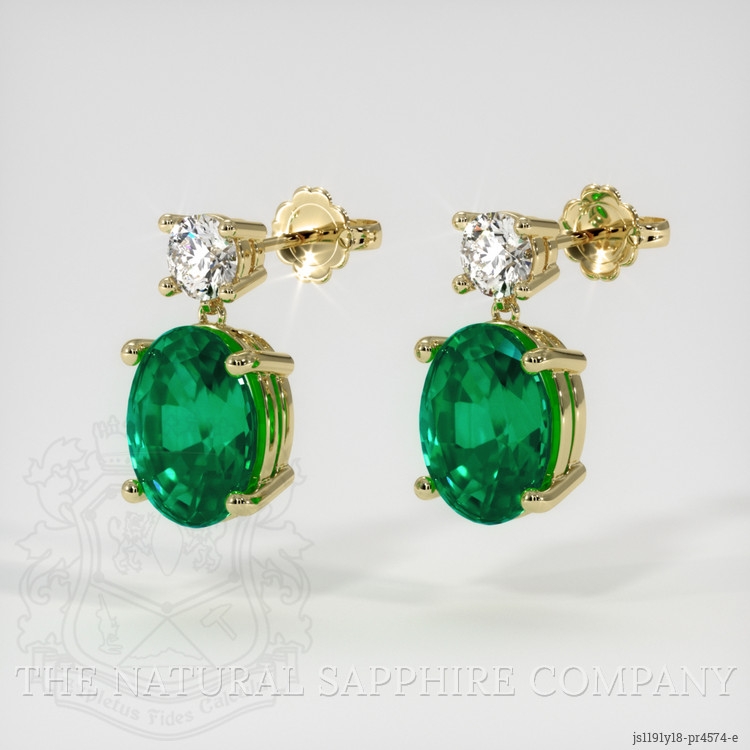 The earrings feature a beautiful, transparent pair of emeralds that are 2.31 total carat weight. They are oval shape green emeralds, with the dimensions of 8.08 x 6.11 x 4.06 mm and are mixed brilliant cut, have a clarity grade of very slightly included (evaluated at eye level), vivid color saturation, and an excellent polish. The origin of this pair of emeralds is Zambia.