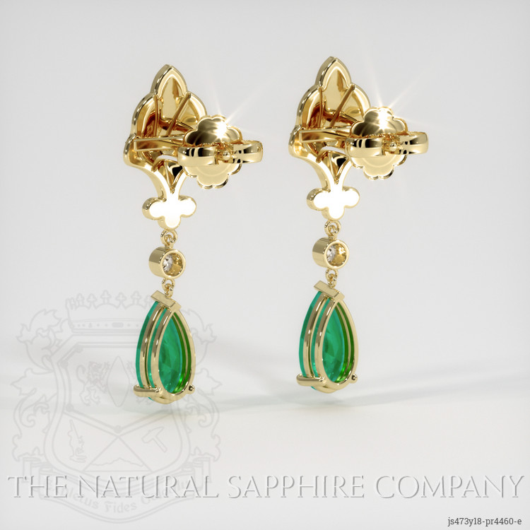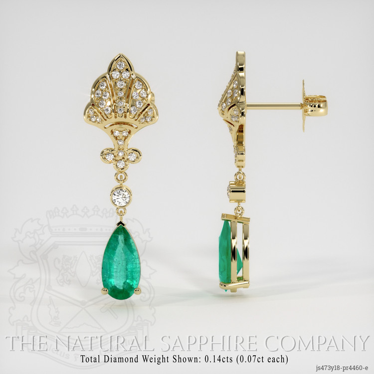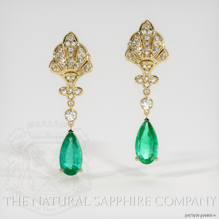 The earrings feature a beautiful, transparent pair of emeralds that are 1.62 total carat weight. They are pear shape green emeralds, with the dimensions of 9.74 x 4.95 x 3.11 mm and are mixed brilliant cut, have a clarity grade of very slightly included (evaluated at eye level), medium color saturation, and an excellent polish. The origin of this pair of emeralds is Zambia.