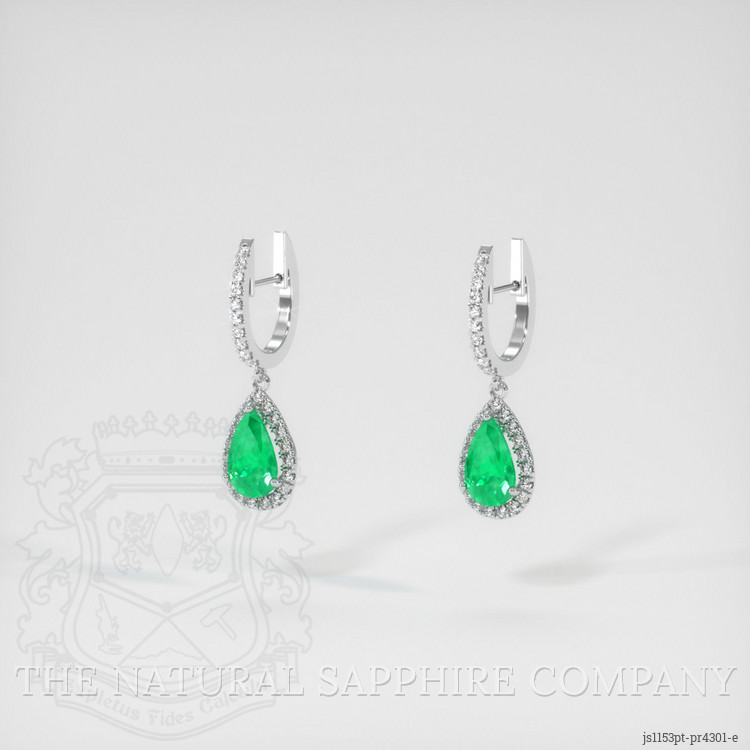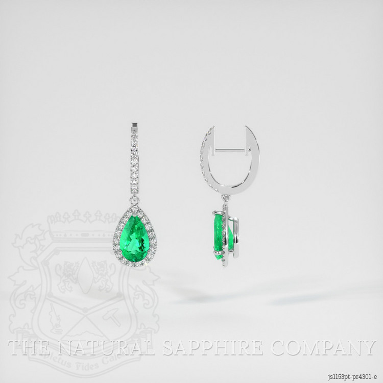 The earrings feature a beautiful, transparent pair of emeralds that are 2.74 total carat weight. They are pear shape green emeralds, with the dimensions of 10.27 x 6.43 x 4.59 mm and are mixed brilliant cut, have a clarity grade of very slightly included (evaluated at eye level), light color saturation, and an excellent polish. The origin of this pair of emeralds is Colombia.