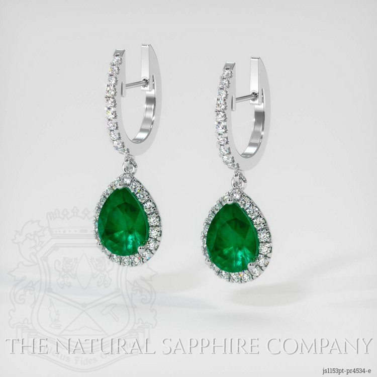 The earrings feature a beautiful, transparent pair of emeralds that are 2.96 total carat weight. They are pear shape green emeralds, with the dimensions of 9.10 x 7.11 x 4.52 mm and are mixed brilliant cut, have a clarity grade of very slightly included (evaluated at eye level), vivid color saturation, and an excellent polish. The origin of this pair of emeralds is Zambia.
