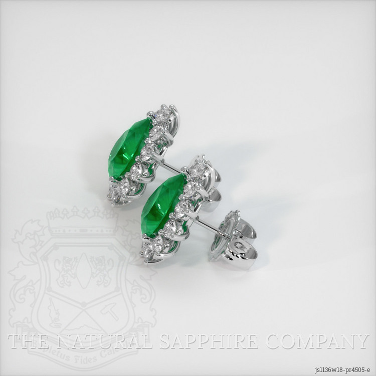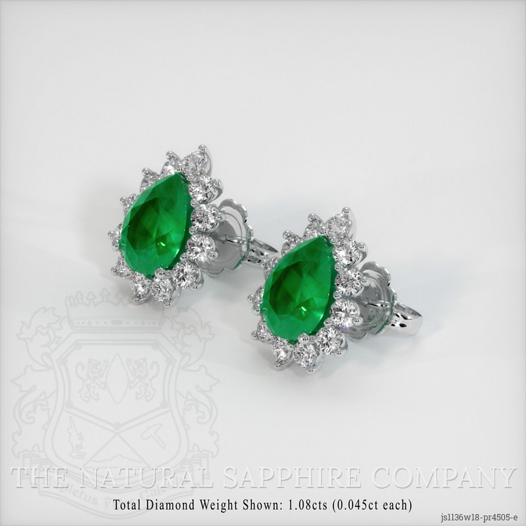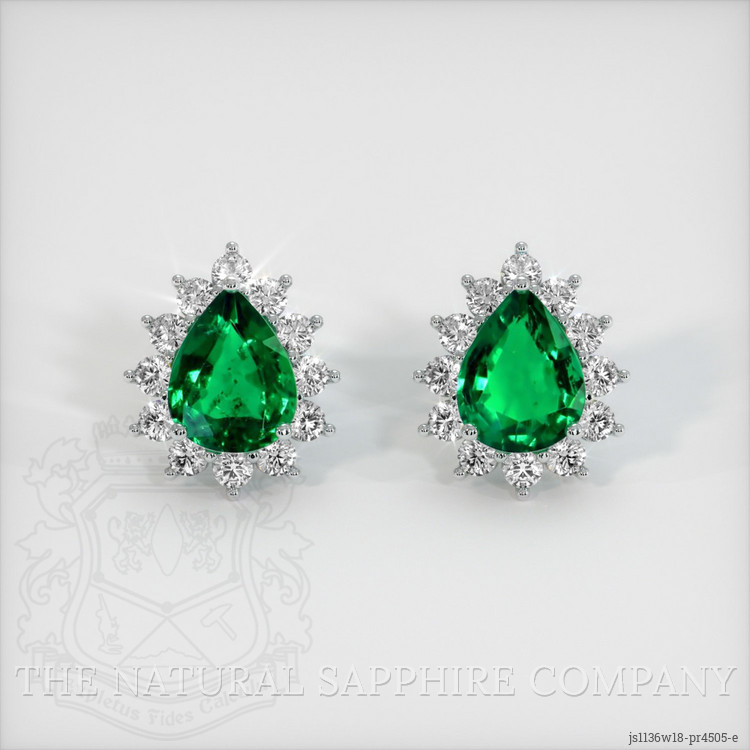 The earrings feature a beautiful, transparent pair of emeralds that are 3.19 total carat weight. They are pear shape green emeralds, with the dimensions of 9.61 x 7.46 x 4.31 mm and are mixed brilliant cut, have a clarity grade of slightly included (evaluated at eye level), vivid color saturation, and an excellent polish. The origin of this pair of emeralds is Zambia.