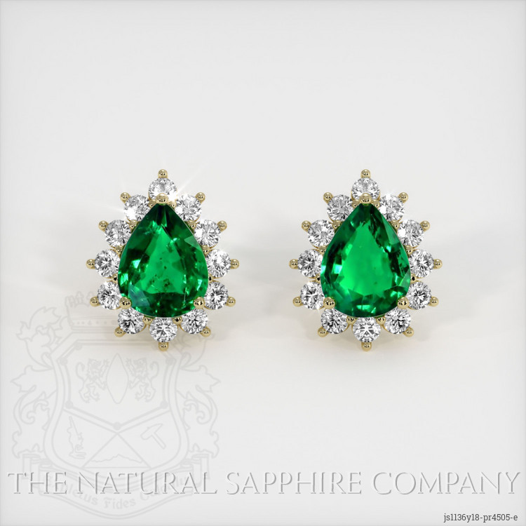 The earrings feature a beautiful, transparent pair of emeralds that are 3.19 total carat weight. They are pear shape green emeralds, with the dimensions of 9.61 x 7.46 x 4.31 mm and are mixed brilliant cut, have a clarity grade of slightly included (evaluated at eye level), vivid color saturation, and an excellent polish. The origin of this pair of emeralds is Zambia.