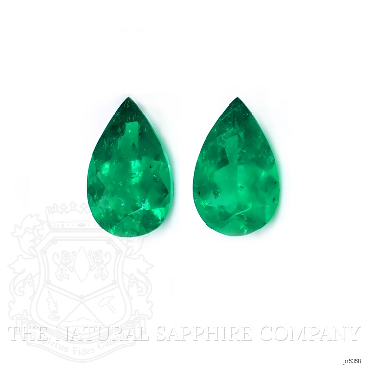 The earrings feature a beautiful, transparent pair of emeralds that are 6.17 total carat weight. They are pear shape green emeralds, with the dimensions of 13.38 x 8.34 x 5.62 mm and are mixed brilliant cut, have a clarity grade of slightly included (evaluated at eye level), vivid color saturation, and an excellent polish. The origin of this pair of emeralds is Colombia.