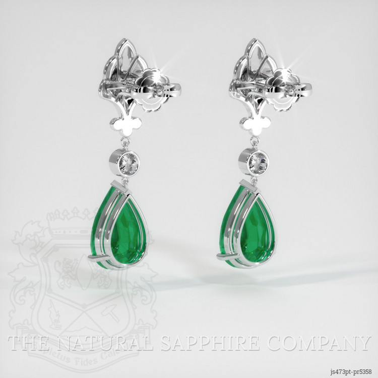 The earrings feature a beautiful, transparent pair of emeralds that are 6.17 total carat weight. They are pear shape green emeralds, with the dimensions of 13.38 x 8.34 x 5.62 mm and are mixed brilliant cut, have a clarity grade of slightly included (evaluated at eye level), vivid color saturation, and an excellent polish. The origin of this pair of emeralds is Colombia.