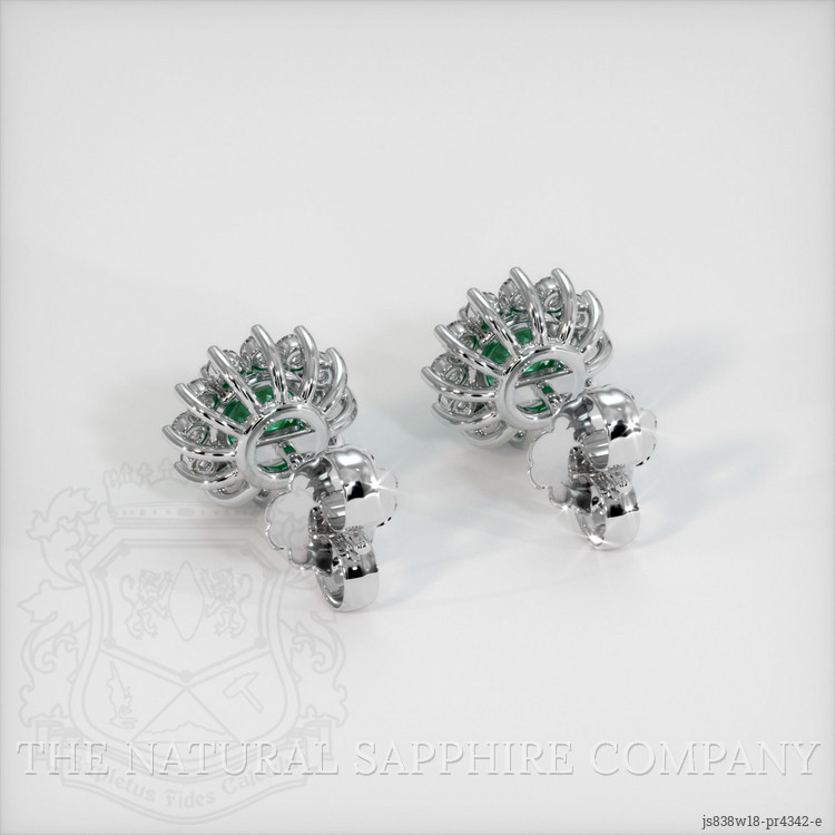The earrings feature a beautiful, transparent pair of emeralds that are 0.61 total carat weight. They are round shape green emeralds, with the dimensions of 4.54 x 4.49 x 2.97 mm and are mixed brilliant cut, have a clarity grade of slightly included (evaluated at eye level), medium color saturation, and an excellent polish. The origin of this pair of emeralds is Zambia.