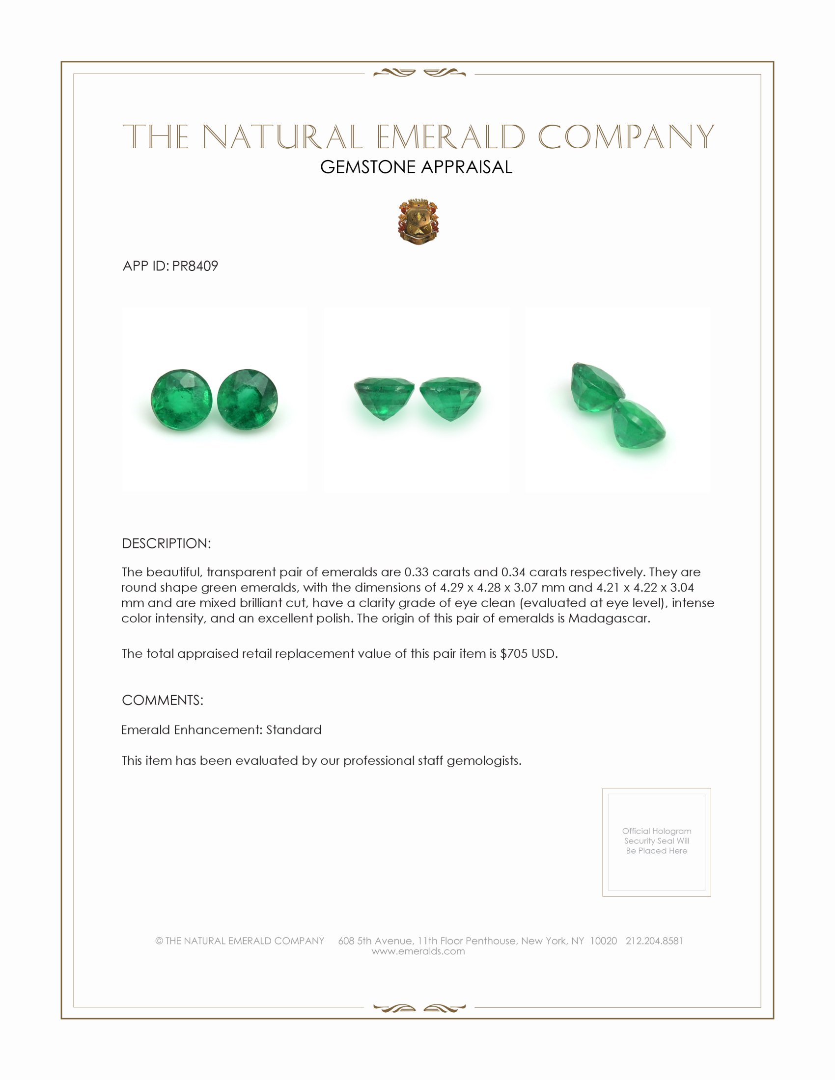 Our emeralds hail from the verdant landscapes of Madagascar, each stone a silent witness to the beauty of the natural world. Cradled by the earth, these gems boast a mixed brilliant cut, achieved with precision that reveals their mesmerizing depth, allowing the intense color saturation to captivate in every glance. With an eye-clean clarity grade, these emeralds ensure a visual purity, creating an unhindered display of their vibrant green luster. The careful polish enhances their perfect dimensions of 4.21 x 4.22 x 3.04 mm, ensuring that their sparkle never fades and that each facet tells an enchanting story of the earth’s artistry.