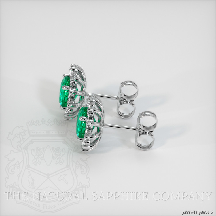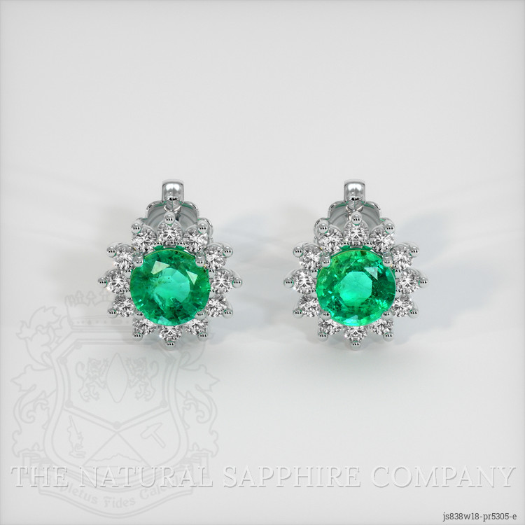 The pair of earrings prominently features pristine, transparent emeralds that boast a total carat weight of 1.25. These round-shaped emeralds exhibit a rich green hue, with dimensions measuring 5.78 x 5.67 x 3.55 mm. They are skillfully cut in a mixed brilliant fashion, displaying a very slightly included clarity grade upon visual inspection, intense color saturation, and an excellent polish. These emeralds are sourced from Zambia, known for producing high-quality gemstones.