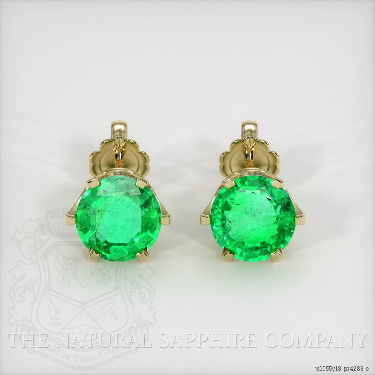 The earrings feature a beautiful, transparent pair of emeralds that are 2.91 total carat weight. They are round shape green emeralds, with the dimensions of 7.71 x 7.63 x 4.07 mm and are mixed brilliant cut, have a clarity grade of very slightly included (evaluated at eye level), light color saturation, and an excellent polish. The origin of this pair of emeralds is Brazil.