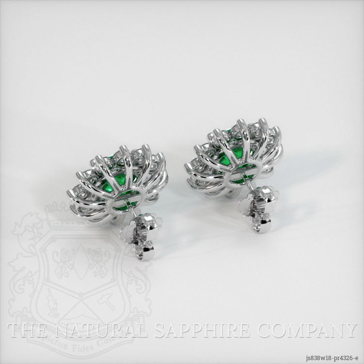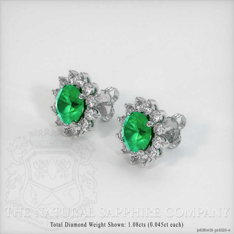 The earrings feature a beautiful, transparent pair of emeralds that are 2.99 total carat weight. They are round shape green emeralds, with the dimensions of 7.55 x 7.45 x 4.74 mm and are mixed brilliant cut, have a clarity grade of slightly included (evaluated at eye level), vivid color saturation, and an excellent polish. The origin of this pair of emeralds is Zambia.