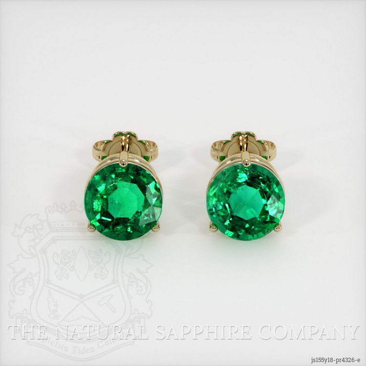 The earrings feature a beautiful, transparent pair of emeralds that are 2.99 total carat weight. They are round shape green emeralds, with the dimensions of 7.55 x 7.45 x 4.74 mm and are mixed brilliant cut, have a clarity grade of slightly included (evaluated at eye level), vivid color saturation, and an excellent polish. The origin of this pair of emeralds is Zambia.