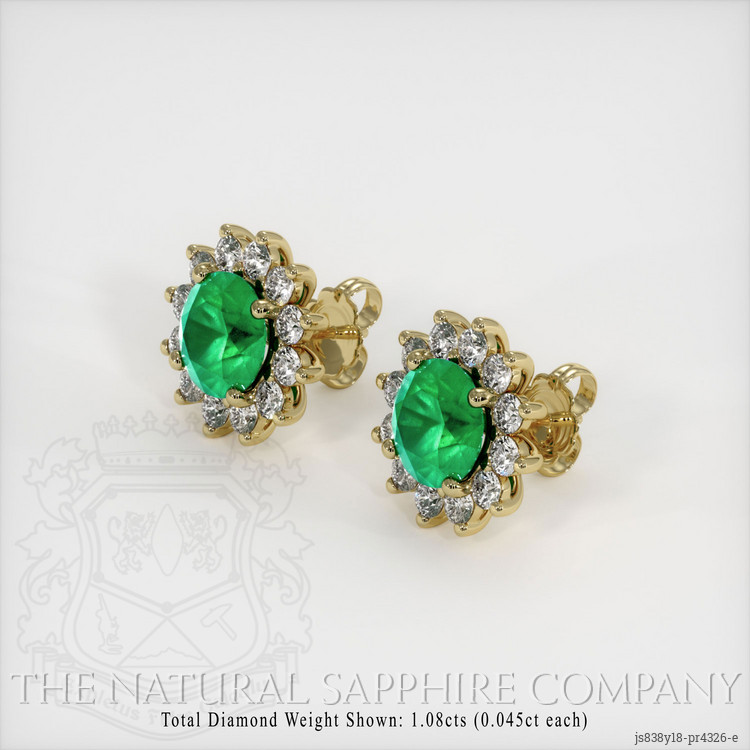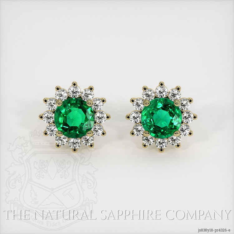 The earrings feature a beautiful, transparent pair of emeralds that are 2.99 total carat weight. They are round shape green emeralds, with the dimensions of 7.55 x 7.45 x 4.74 mm and are mixed brilliant cut, have a clarity grade of slightly included (evaluated at eye level), vivid color saturation, and an excellent polish. The origin of this pair of emeralds is Zambia.