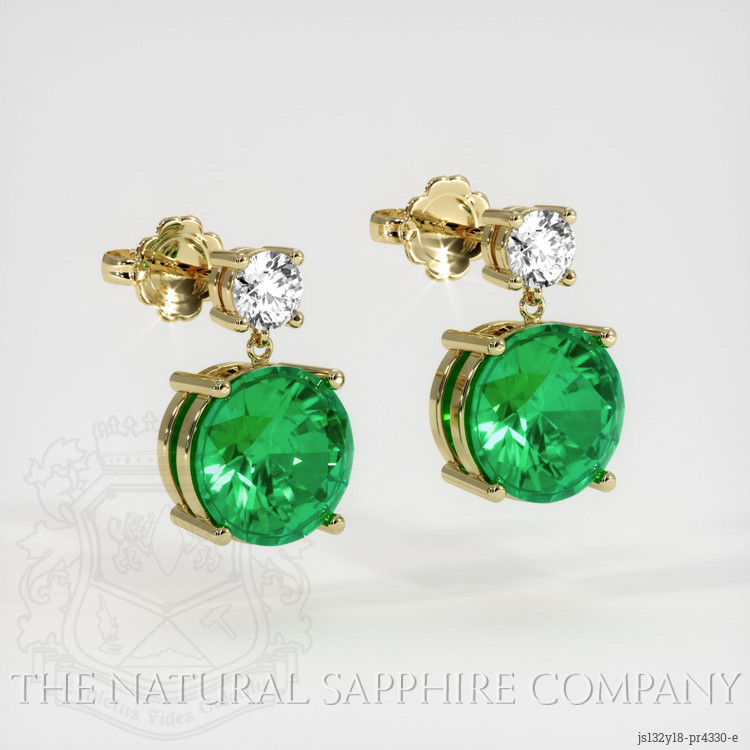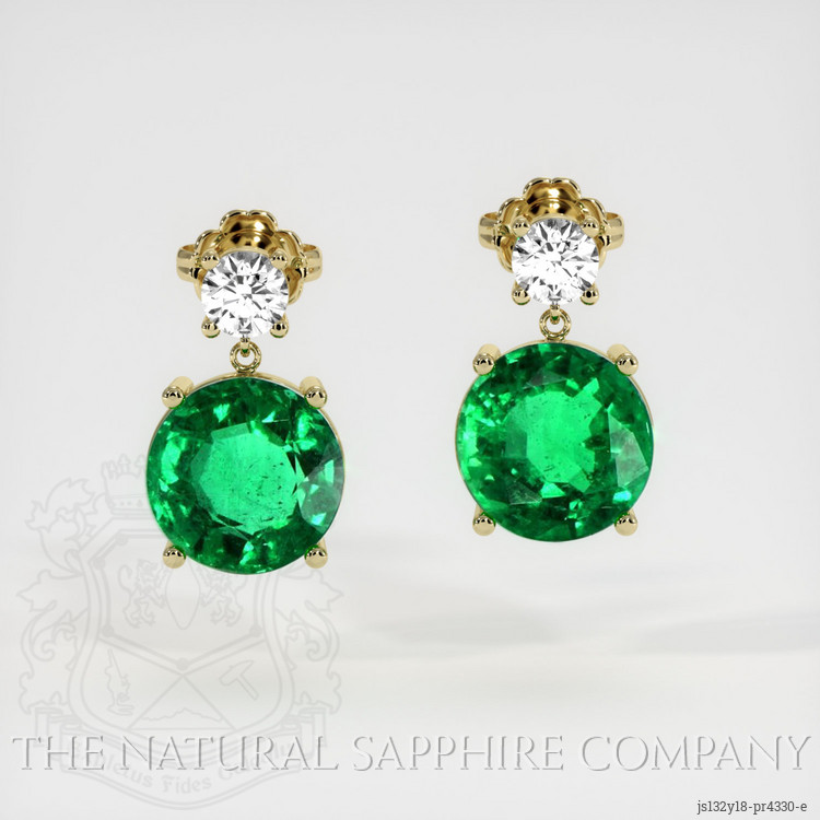The earrings feature a beautiful, transparent pair of emeralds that are 3.20 total carat weight. They are round shape green emeralds, with the dimensions of 7.79 x 7.68 x 4.57 mm and are mixed brilliant cut, have a clarity grade of very slightly included (evaluated at eye level), vivid color saturation, and an excellent polish. The origin of this pair of emeralds is Zambia.
