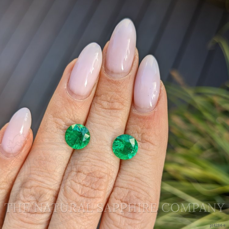 The earrings feature a beautiful, transparent pair of emeralds that are 3.23 total carat weight. They are round shape green emeralds, with the dimensions of 8.08 x 8.02 x 5.12 mm and are mixed brilliant cut, have a clarity grade of slightly included (evaluated at eye level), vivid color saturation, and an excellent polish. The origin of this pair of emeralds is Brazil.