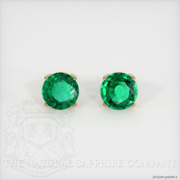 The earrings feature a beautiful, transparent pair of emeralds that are 7.25 total carat weight. They are round shape green emeralds, with the dimensions of 10.54 x 10.48 x 5.82 mm and are mixed brilliant cut, have a clarity grade of very slightly included (evaluated at eye level), intense color saturation, and an excellent polish. The origin of this pair of emeralds is Zambia.