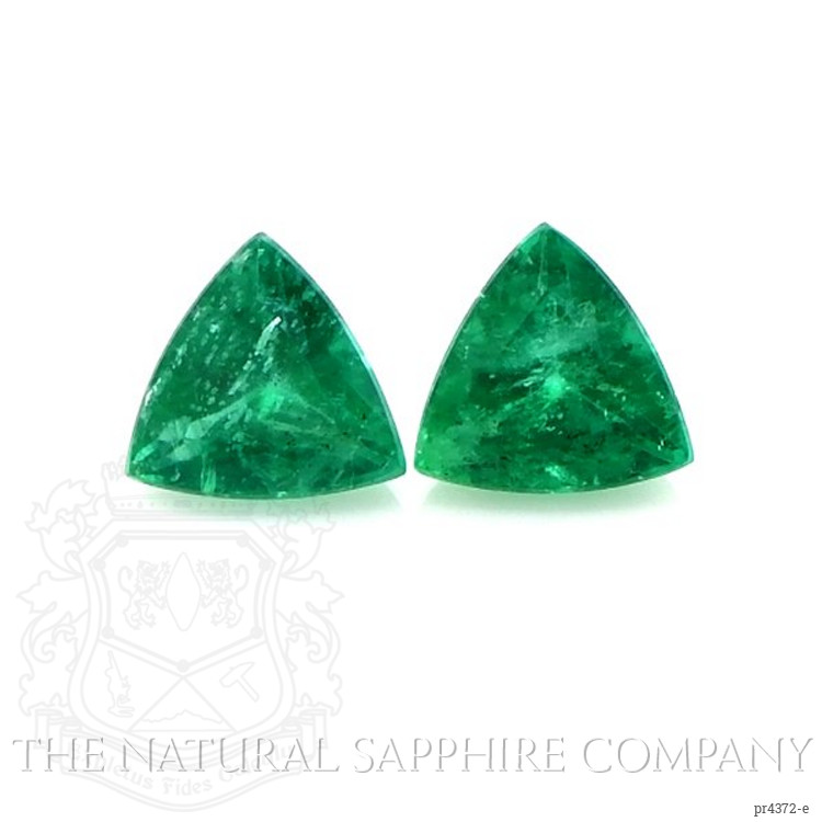 The earrings feature a beautiful, transparent pair of emeralds that are 1.05 total carat weight. They are trillion shape green emeralds, with the dimensions of 5.42 x 5.60 x 3.76 mm and are trillion cut, have a clarity grade of very slightly included (evaluated at eye level), intense color saturation, and an excellent polish. The origin of this pair of emeralds is Zambia.