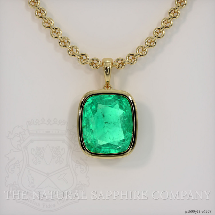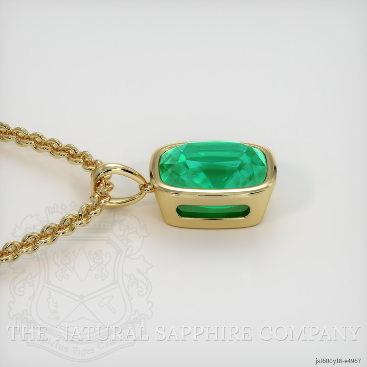 The necklace features a beautiful, transparent GIA certified 5.80 carat cushion shape green emerald with the dimensions of 12.03 x 10.32 x 6.94 mm and a mixed brilliant cut. It has a clarity grade of slightly included (evaluated at eye level), intense color saturation, and an excellent polish. The origin of this emerald is Ethiopia.