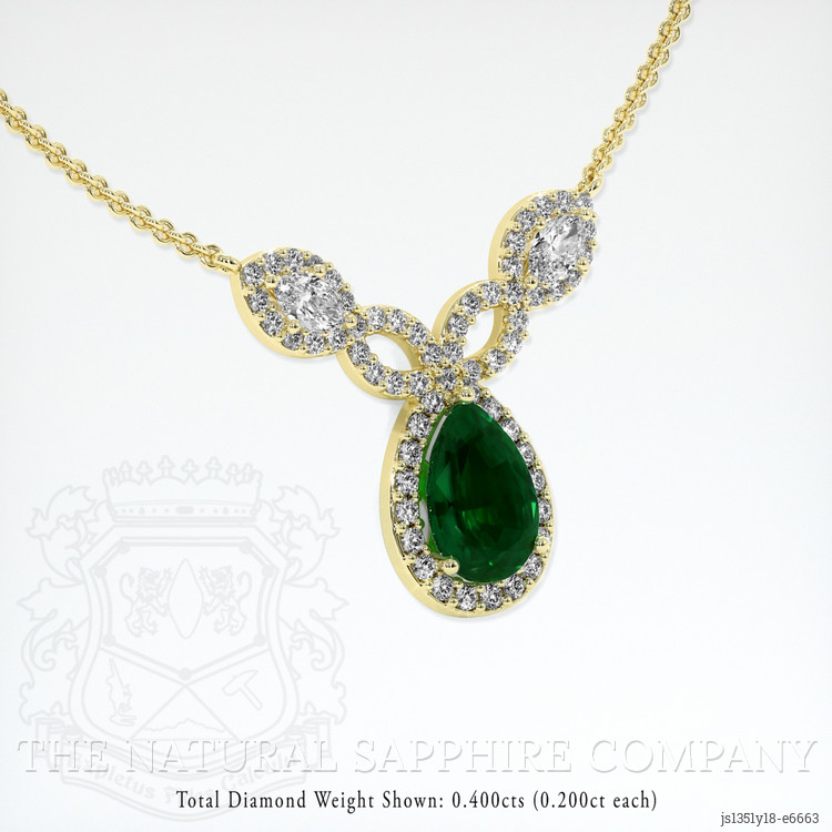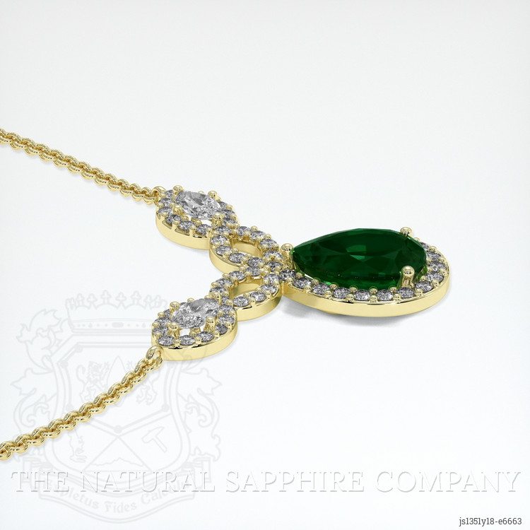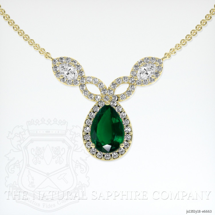 In a world where dreams take form in the delicate dance of light and shadow, where the day softly embraces the night, emerges a masterpiece from The Natural Emerald Company. This enchanting necklace is a testament to everlasting elegance, lovingly crafted in radiant 18K yellow gold. At its heart rests a mesmerizing 1.90 carat pear-shaped emerald, sourced from the exotic mines of Brazil, glowing with a verdant brilliance that seems to hold the evergreens of lush forests within.