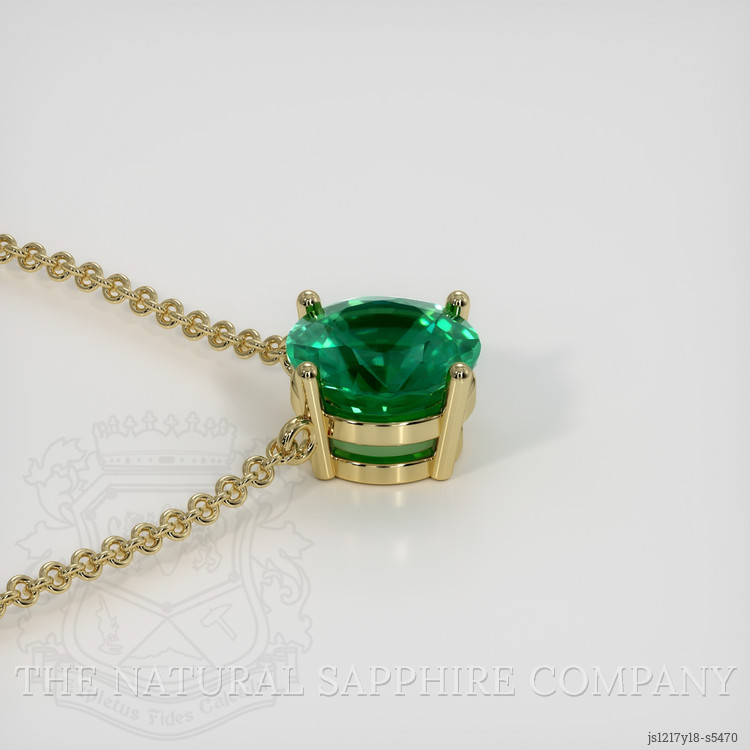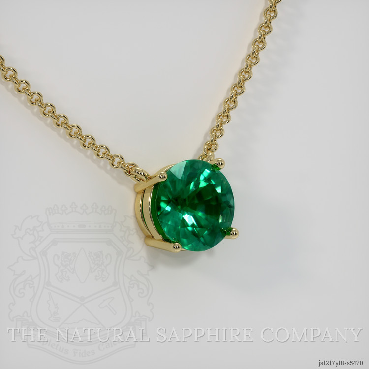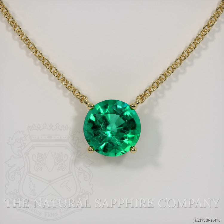 The necklace features a beautiful, transparent 1.56 carat round shape green emerald with the dimensions of 7.92 x 7.87 x 4.99 mm and a mixed brilliant cut. It has a clarity grade of very slightly included (evaluated at eye level), vivid color saturation, and an excellent polish. The origin of this emerald is Zambia.