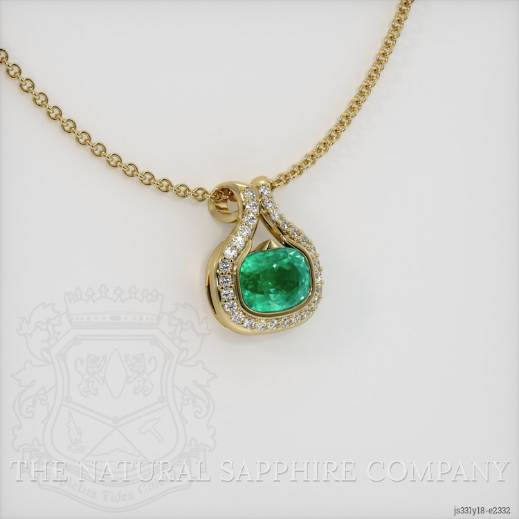 The pendant features a beautiful, transparent 1.06 carat cushion shape green emerald with the dimensions of 6.80 x 5.33 x 4.32 mm and a mixed brilliant cut. It has a clarity grade of slightly included (evaluated at eye level), medium color saturation, and an excellent polish. The origin of this emerald is Zambia.