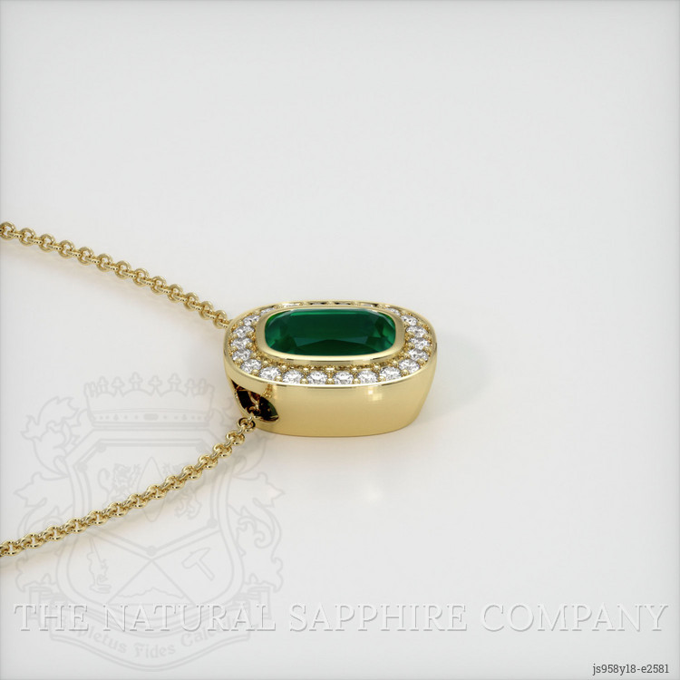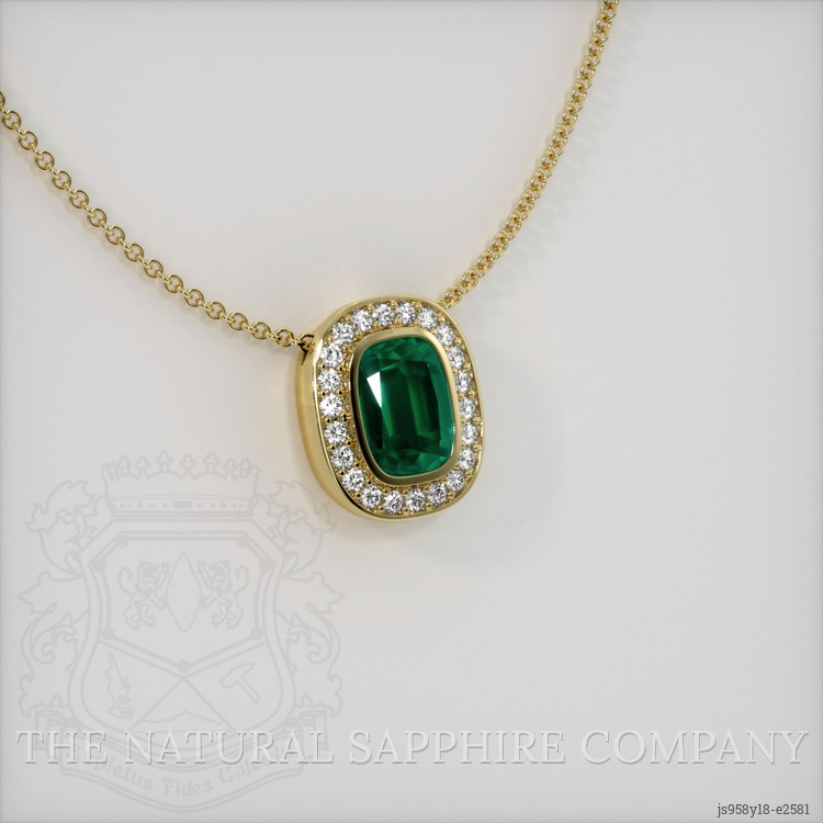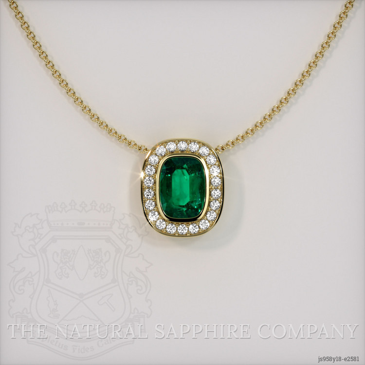 The pendant features a beautiful, transparent 3.11 carat cushion shape green emerald with the dimensions of 9.97 x 8.01 x 5.61 mm and a mixed brilliant cut. It has a clarity grade of slightly included (evaluated at eye level), vivid color saturation, and an excellent polish. The origin of this emerald is Zambia.