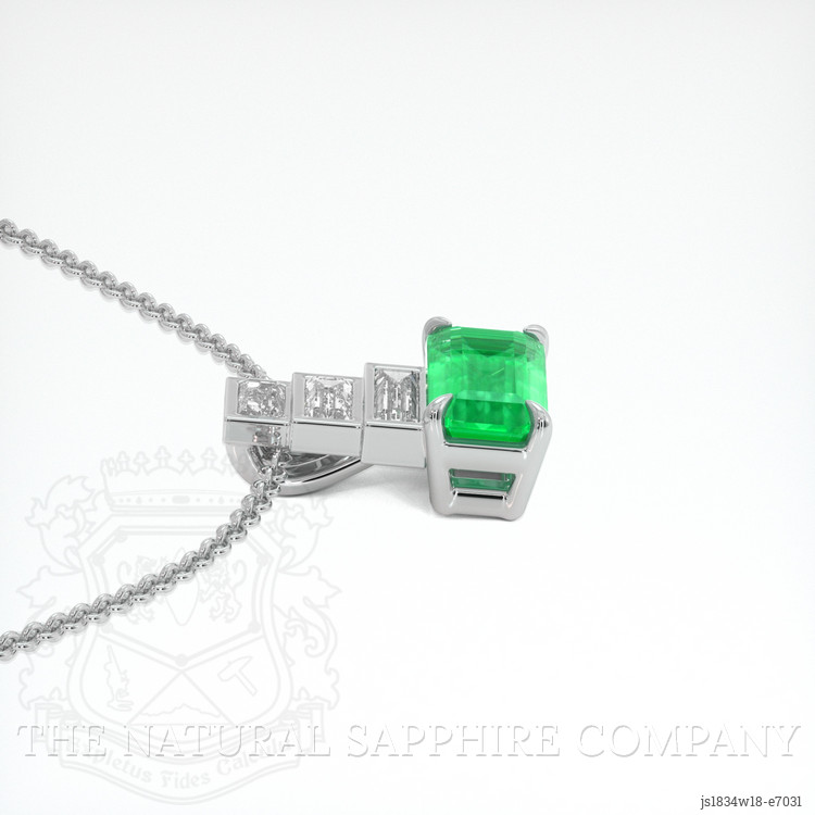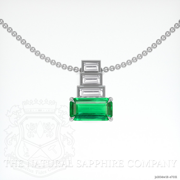 This pendant from The Natural Emerald Company is crafted entirely in 18K white gold, featuring a transparent 0.60 carat emerald cut green emerald, measuring 7.32 x 3.94 x 2.71 mm, with vivid color saturation, very very slightly included clarity when evaluated at eye level, and an excellent polish. The emerald is of Afghan origin and has standard enhancement, which is typical for fine natural stones, and it is presented with three white baguette shaped natural diamonds weighing approximately 0.08 carats, 0.06 carats, and 0.05 carats respectively, clarity grades VS1 and VS2, and a color grade of E. The total diamond weight is approximately 0.19 carats. Compared with lighter color stones or heavily included material commonly found on the market, this emerald stands out for its exceptional transparency and saturated tone, qualities that are rare at this carat size in natural Afghan material. The straight baguette diamonds are of high color and clarity, which provides a crisp, geometric contrast to the vivid green center, creating a refined look that reads as superior in both material and finish when compared to many mass market alternatives.