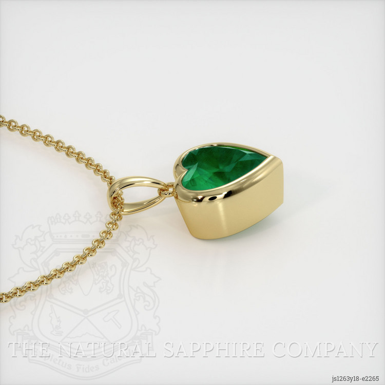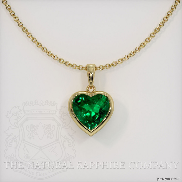 The pendant features a beautiful, transparent 1.58 carat heart shape green emerald with the dimensions of 8.19 x 8.47 x 4.75 mm and a mixed brilliant cut. It has a clarity grade of very slightly included (evaluated at eye level), vivid color saturation, and an excellent polish. The origin of this emerald is Zambia.