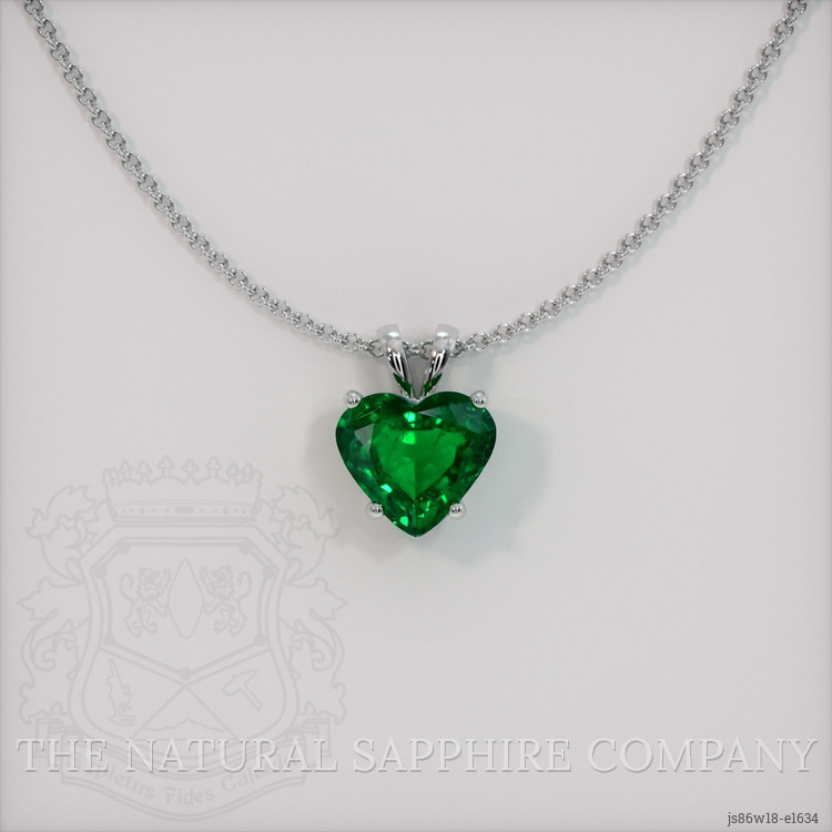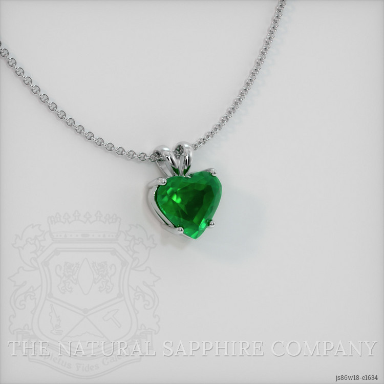 The pendant features a beautiful, transparent 1.83 carat heart shape green emerald with the dimensions of 8.13 x 9.04 x 4.91 mm and a mixed brilliant cut. It has a clarity grade of very slightly included (evaluated at eye level), vivid color saturation, and an excellent polish. The origin of this emerald is Zambia.
